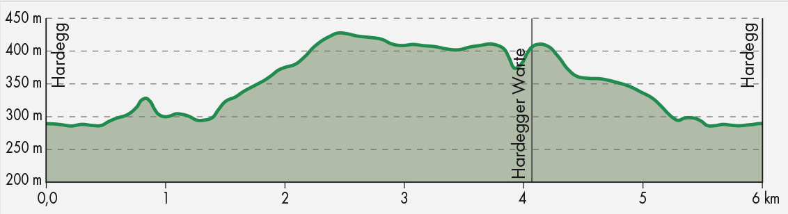 Pokračujte dále po značené trase lesem nahoru a na okraji lesa se pusťte cestou doprava až k asfaltové silnici do Hardeggu.