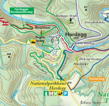 Vom Uhrturm in Hardegg führt linkerhand ein Steig in die Hardegger Vorstadt. Dort angekommen, quert man die Brücke über die Fugnitz und biegt anschließend scharf nach rechts in eine Sackgasse ab, wo der eigentliche Wanderweg seinen Anfang nimmt. Ein schmaler Steig führt nun steil bergan und bringt einen direkt zum sagenumwobenen Reginafelsen. Dieser bietet einen schönen Blick sowohl auf die Vorstadt mit der Burg als auch auf die umliegenden dicht bewaldeten Hänge.Durch einen Eichen- und Hainbuchenwald geht es weiter zum Maxplateau, wo sich - zur Orientierung - auch eine Sendeanlage des ORF befindet. Das von Trockenheit und wärmeliebenden Pflanzen geprägte Plateau bietet den besten Ausblick auf Hardegg. Stadt und Burg liegen quasi dem Wanderer zu Füßen.