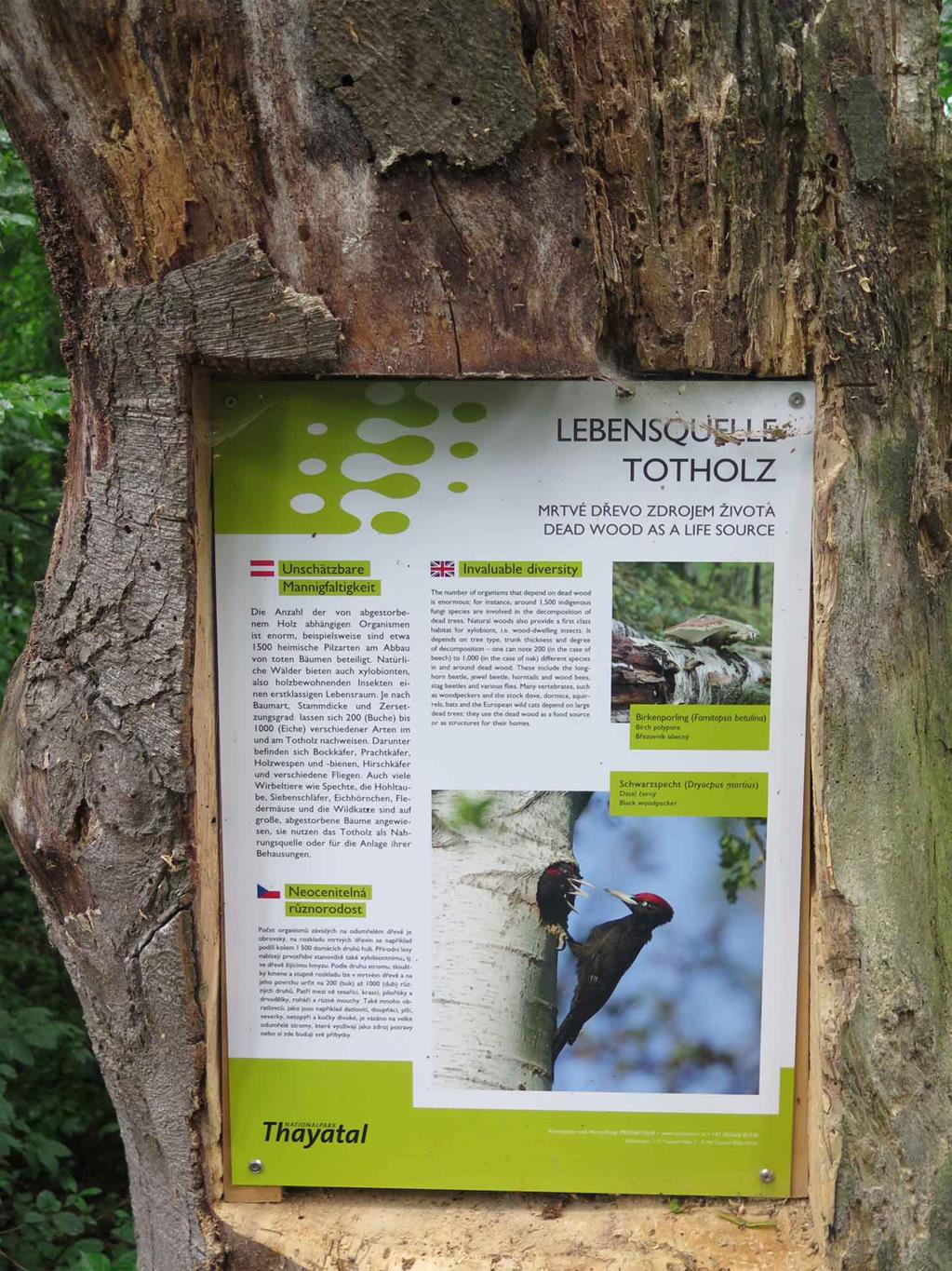 Neben der sich rund ums Jahr ständig wandelnden Natur - von Frühblühern wie Seidelbast und Schlüsselblume bis hin zum verfärbten Herbstlaub von Buchen und urigen Eichen - sorgt der Themenweg mit 6 Stationen für Abwechslung. So erfährt man mehr über die wichtige Bedeutung des Totholzes oder die vorherrschenden Baumarten des Thayatals, kann durch Gucklöcher spähen oder in Tastboxen fühlen.
