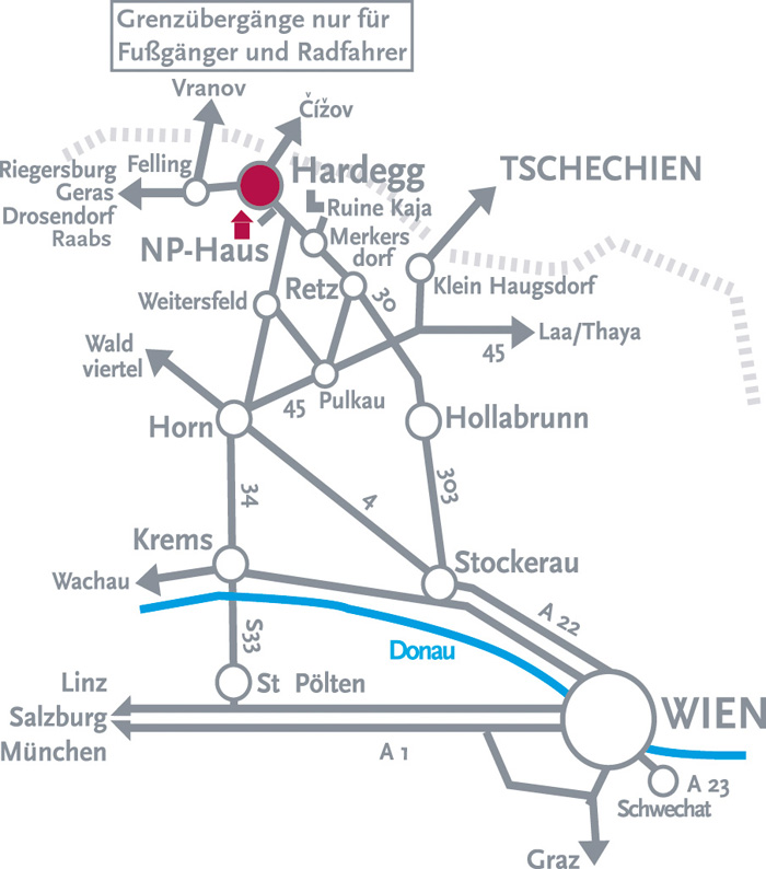In Znojmo (Znaim) nach der Thayabrücke rechts Richtung Retz abbiegen. In Mitterretzbach wieder rechts über Niederfladnitz nach Hardegg; oder von Vranov (Frain) über Šafov, Langau nach Hardegg.GPS Koordinaten für Ihre Autonavigation (GMS)