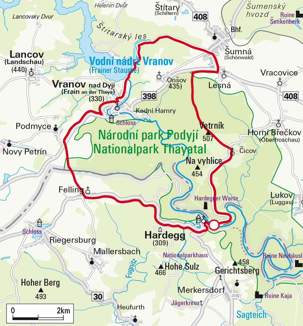 Nationalparkhaus - Hardegg / Thayabrücke - Abstecher zur Hardegger Warte für lohnenswerte Aussicht - Čížov - Ortsende Čížov links Richtung Vranov - Abstecher zu Aussichtspunkt bei Obelisk möglich - Lesná - im Ort den Radsymbolen folgen - Staudamm - Schloss Vranov - gegenüber Ortseinfahrt Podmyče, Feldweg nach Felling - Hardegg - Nationalparkhaus.
