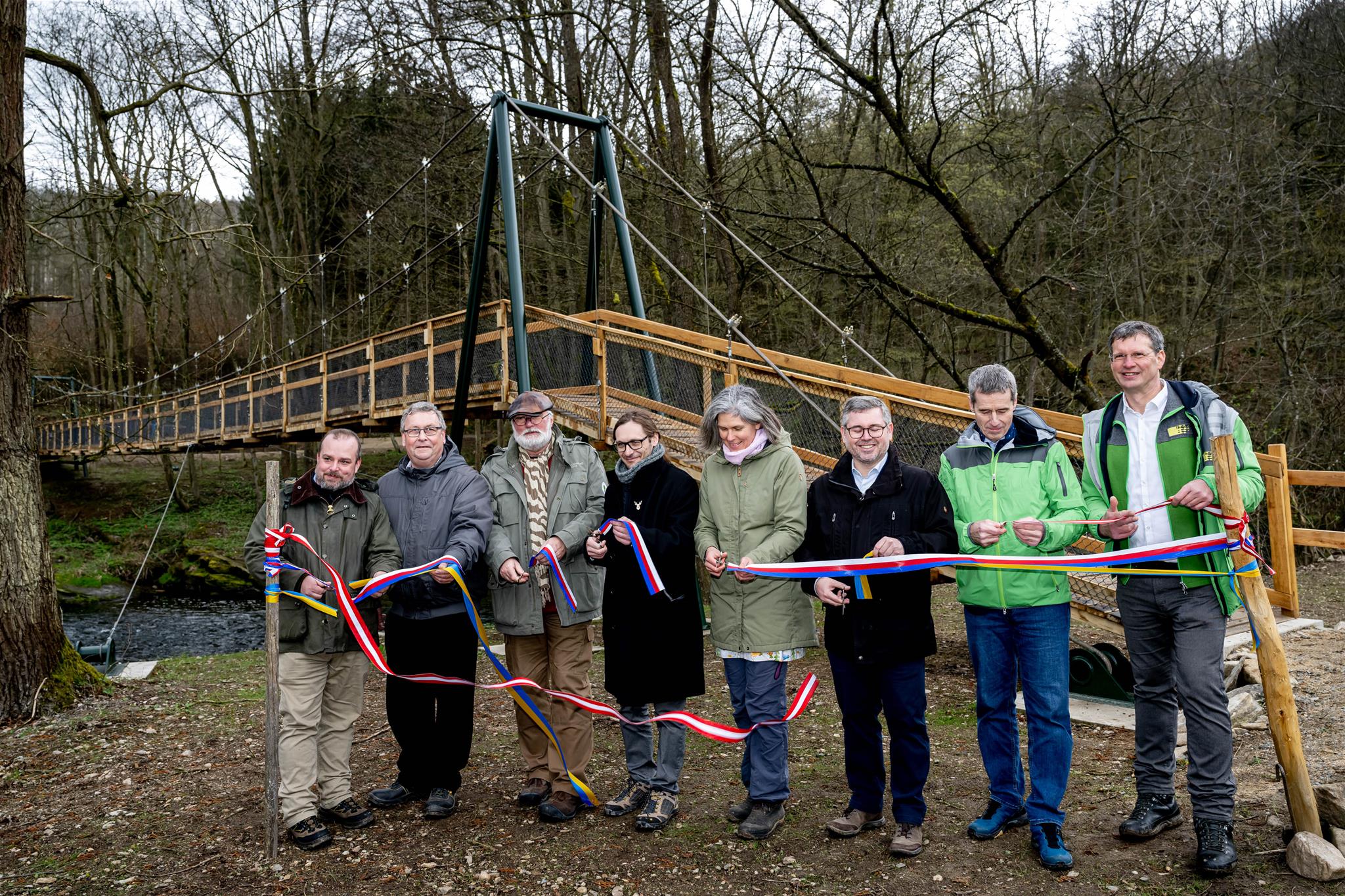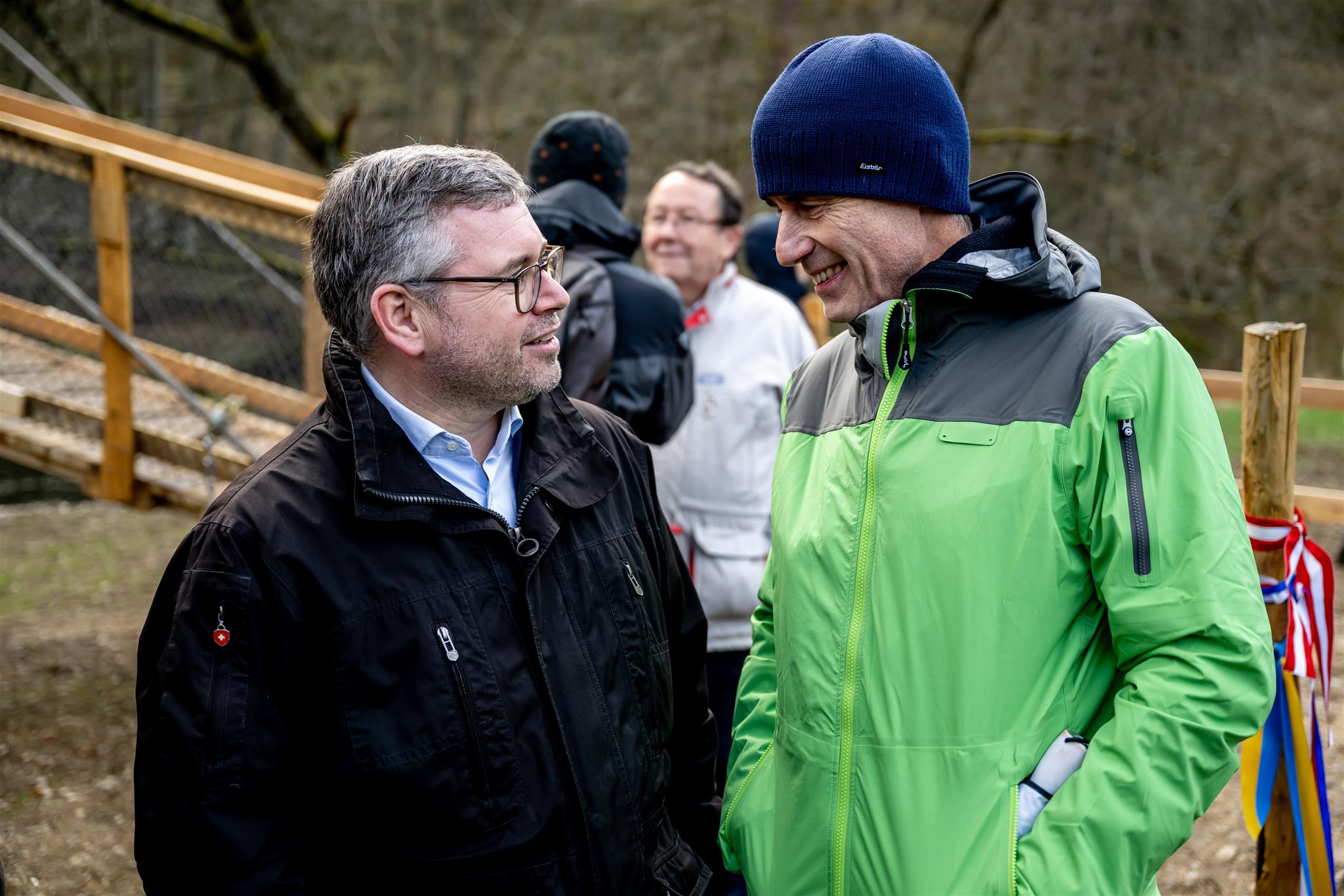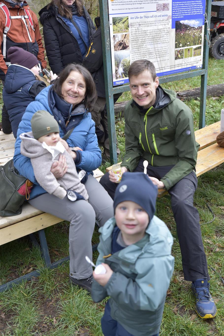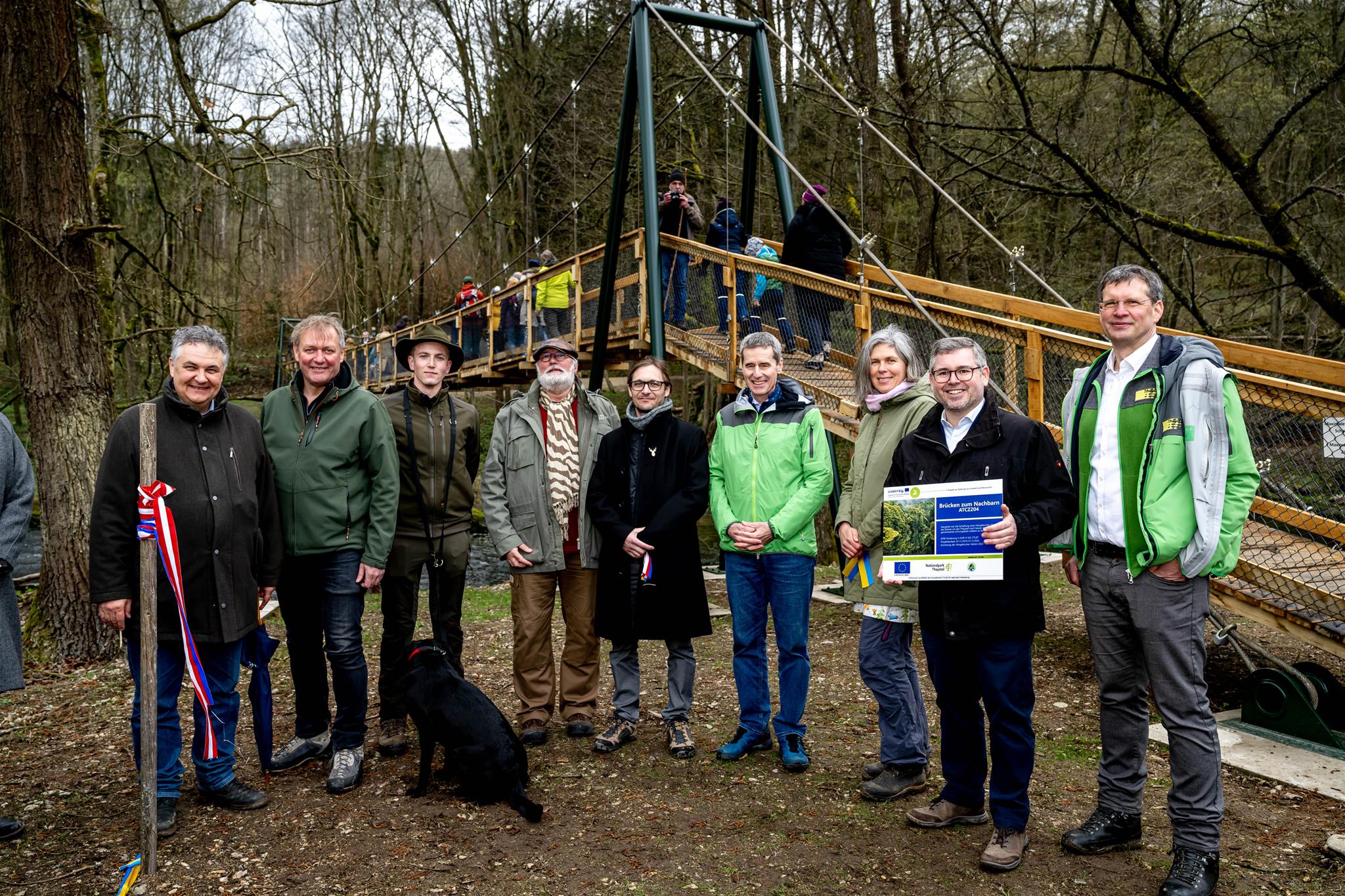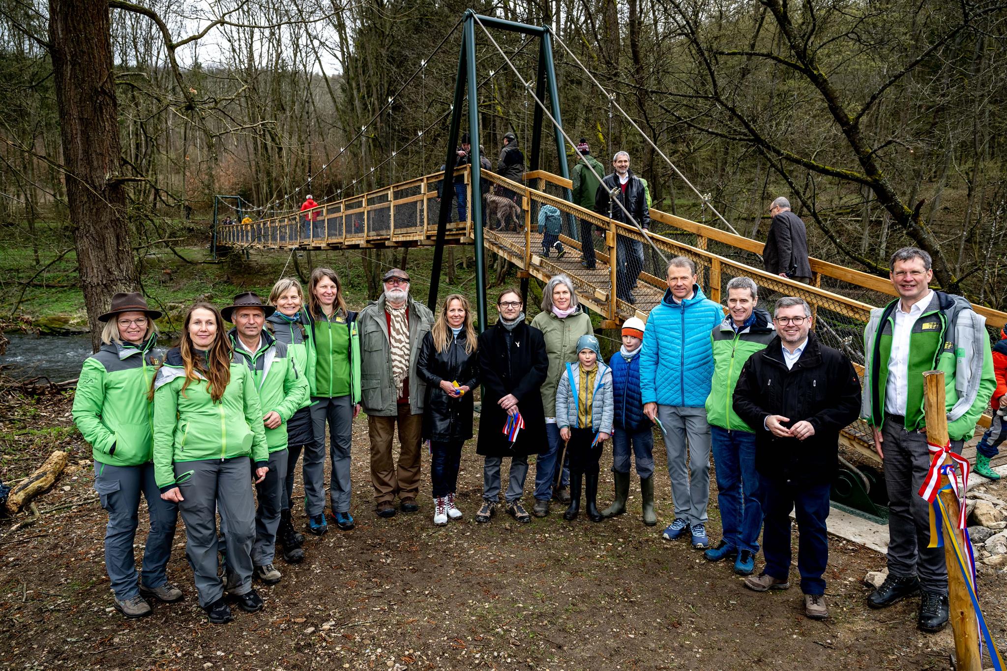 Mit Saisonbeginn 2023 ist der Nationalpark Thayatal nun um eine neue Attraktion reicher. Im Rahmen des INTERREG-Projektes "Brücken zum Nachbarn" konnten die Nationalparks Thayatal und Podyjí im letzten Jahr bei der Einsiedlerwiese, ca. 2 km unterhalb von Hardegg, eine Hängebrücke über die Thaya errichten. Diese wurde nun am Sonntag, den 2. April im Rahmen einer grenzüberschreitenden Wanderung von Landesrat Ludwig Schleritzko in Vertretung von Landeshauptfrau Johanna Mikl-Leitner, Lukáš Dubec, Vize-Kreishauptmann der Region Südmähren, Christian Holzer, Sektionsleiter des Ministeriums für Klimaschutz und Eva Volfova, Vize-Umweltministerin der Tschechischen Republik, feierlich eröffnet. Monsignore Martin Holík aus Brünn segnete das Bauwerk. Die Hängebrücke führt über die Staatsgrenze hinweg, daher verbindet die Brücke nicht nur die beiden Nationalparks Thayatal und Podyjí sondern auch die beiden Länder Österreich und Tschechien. Unter Einbeziehung der Thayabrücke in Hardegg entstand so ein gemeinsamer grenzüberschreitender Rundwanderweg, der nun von natur¬begeisterten Menschen beider Länder genutzt wird.