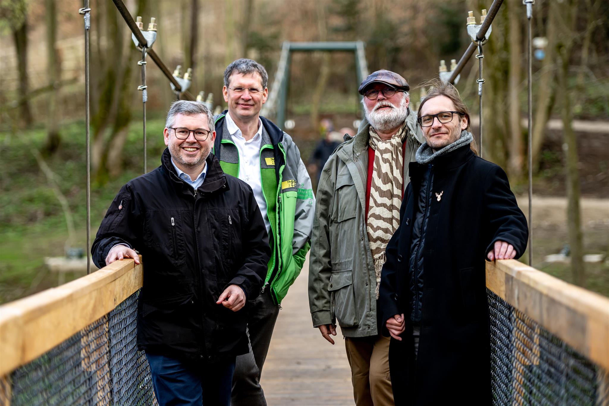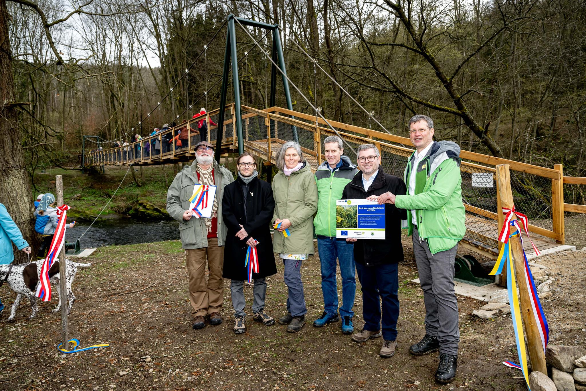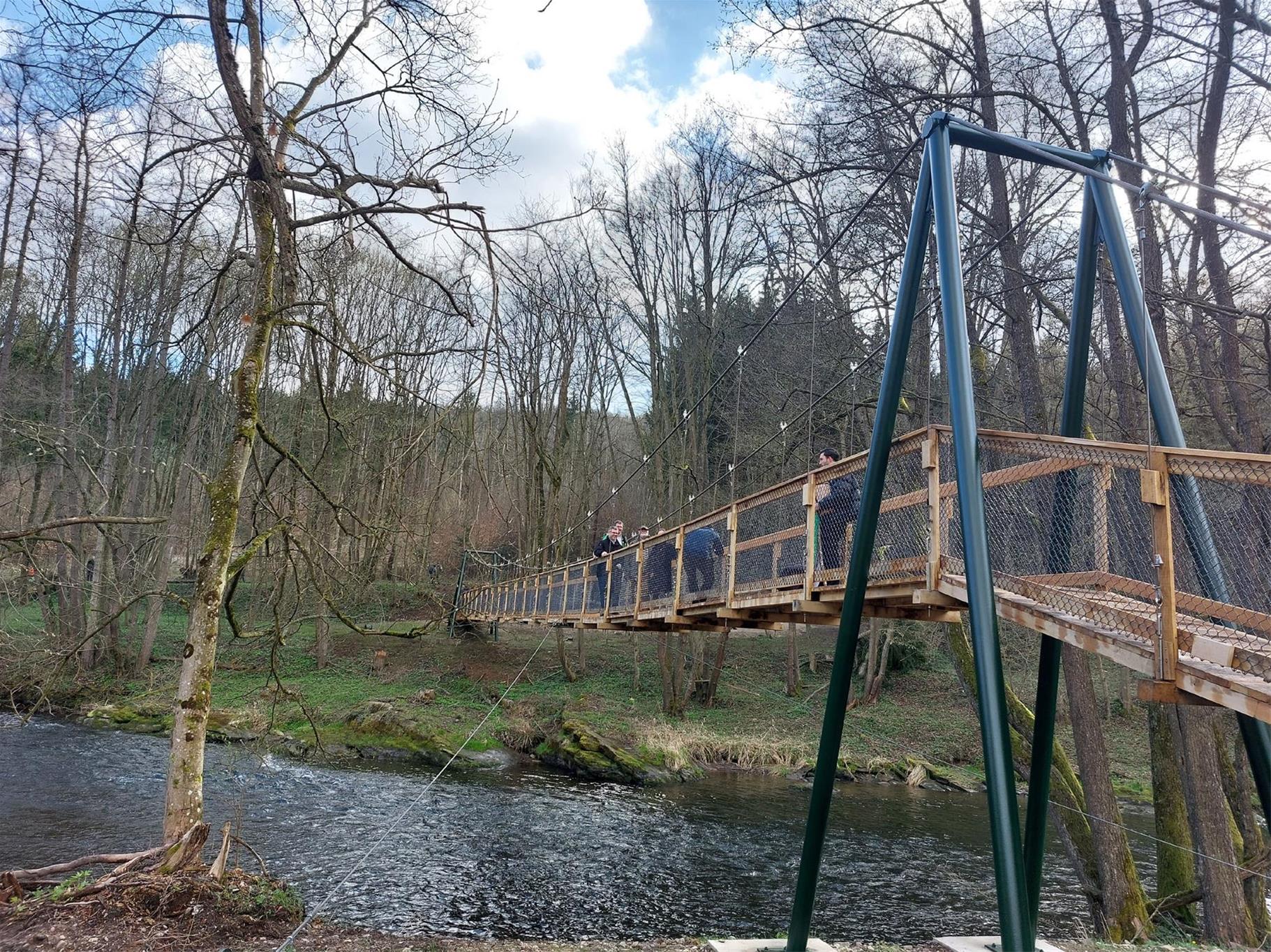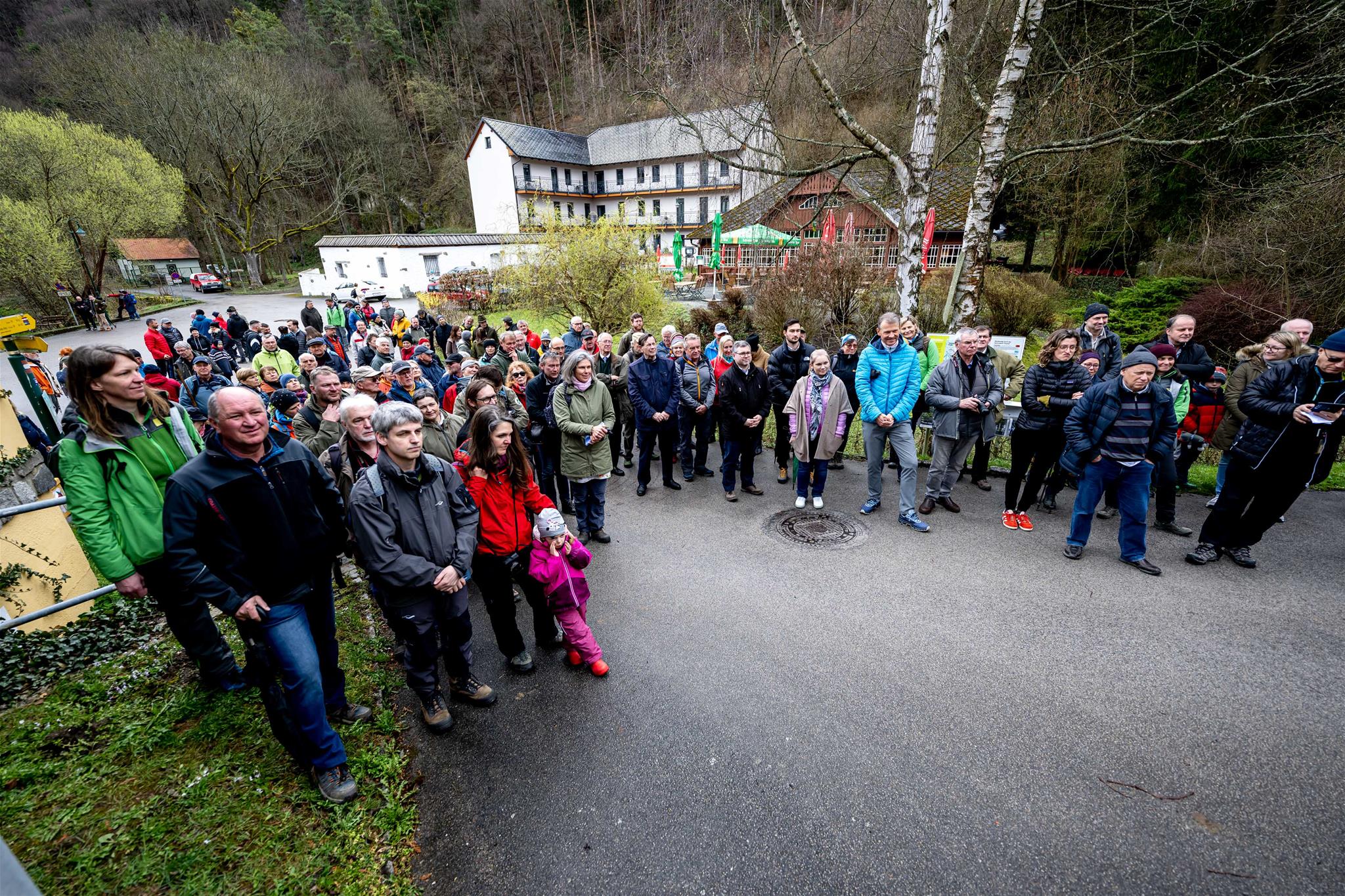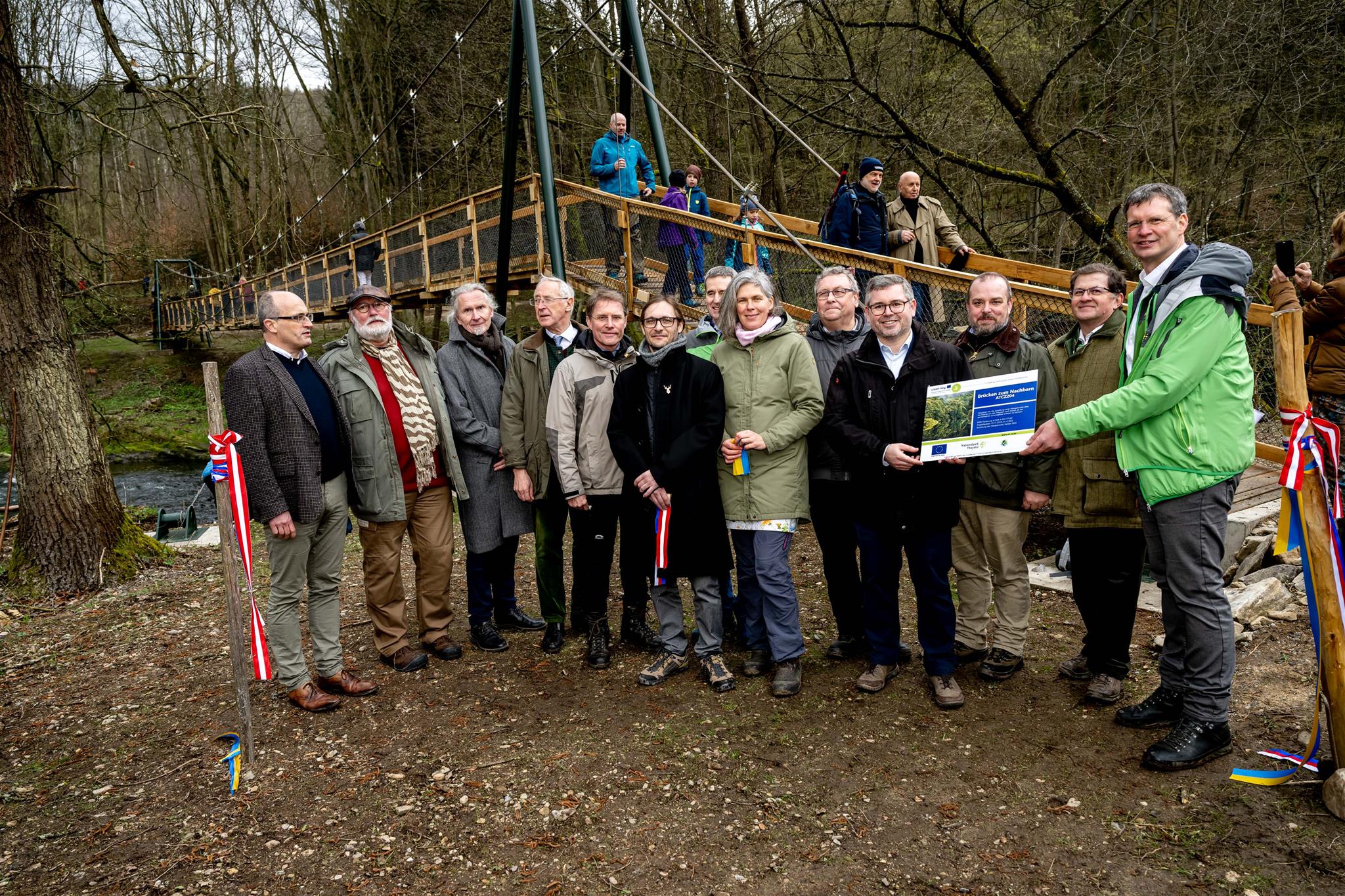 Mit Saisonbeginn 2023 ist der Nationalpark Thayatal nun um eine neue Attraktion reicher. Im Rahmen des INTERREG-Projektes "Brücken zum Nachbarn" konnten die Nationalparks Thayatal und Podyjí im letzten Jahr bei der Einsiedlerwiese, ca. 2 km unterhalb von Hardegg, eine Hängebrücke über die Thaya errichten. Diese wurde nun am Sonntag, den 2. April im Rahmen einer grenzüberschreitenden Wanderung von Landesrat Ludwig Schleritzko in Vertretung von Landeshauptfrau Johanna Mikl-Leitner, Lukáš Dubec, Vize-Kreishauptmann der Region Südmähren, Christian Holzer, Sektionsleiter des Ministeriums für Klimaschutz und Eva Volfova, Vize-Umweltministerin der Tschechischen Republik, feierlich eröffnet. Monsignore Martin Holík aus Brünn segnete das Bauwerk. Die Hängebrücke führt über die Staatsgrenze hinweg, daher verbindet die Brücke nicht nur die beiden Nationalparks Thayatal und Podyjí sondern auch die beiden Länder Österreich und Tschechien. Unter Einbeziehung der Thayabrücke in Hardegg entstand so ein gemeinsamer grenzüberschreitender Rundwanderweg, der nun von natur¬begeisterten Menschen beider Länder genutzt wird.