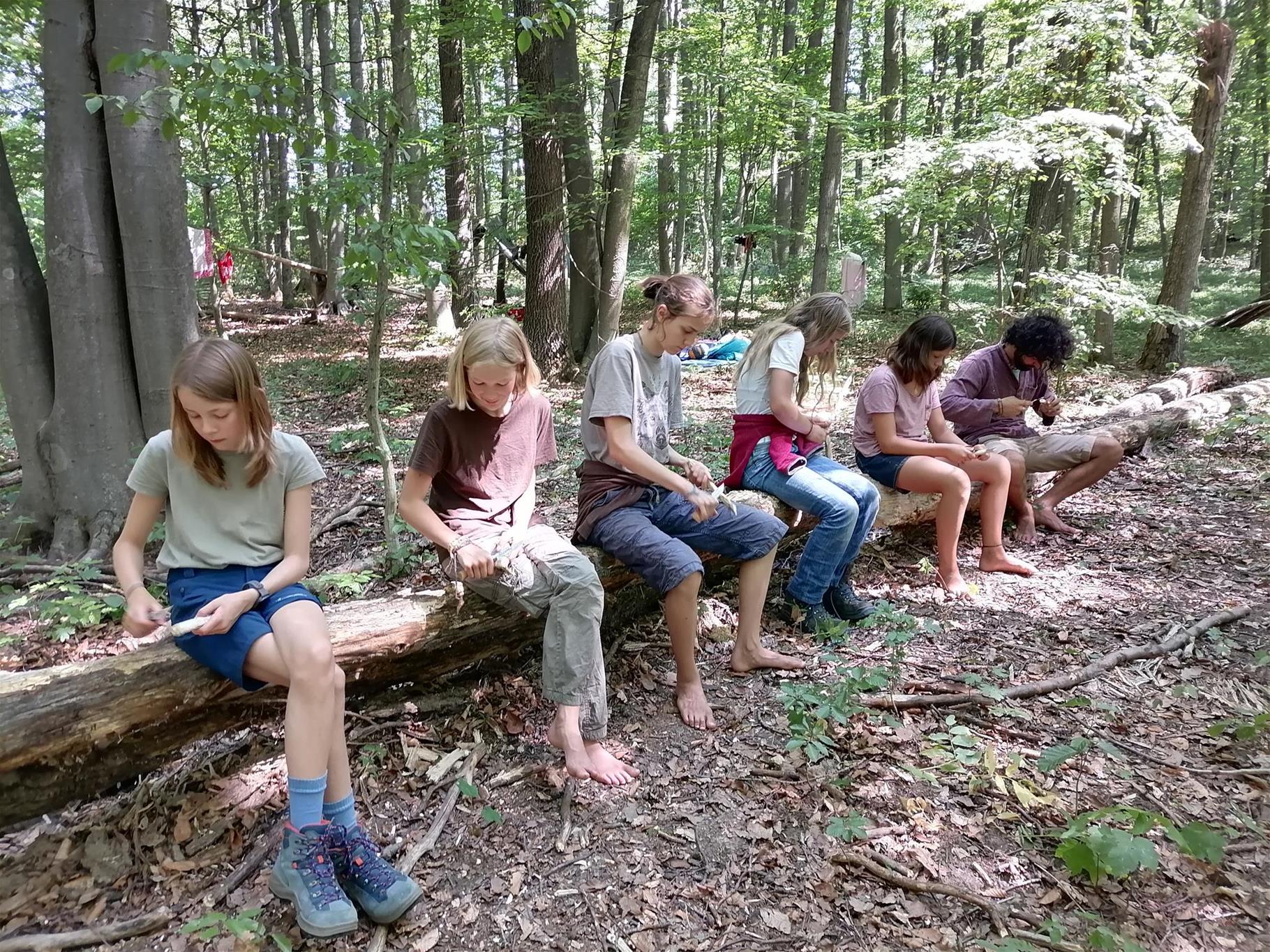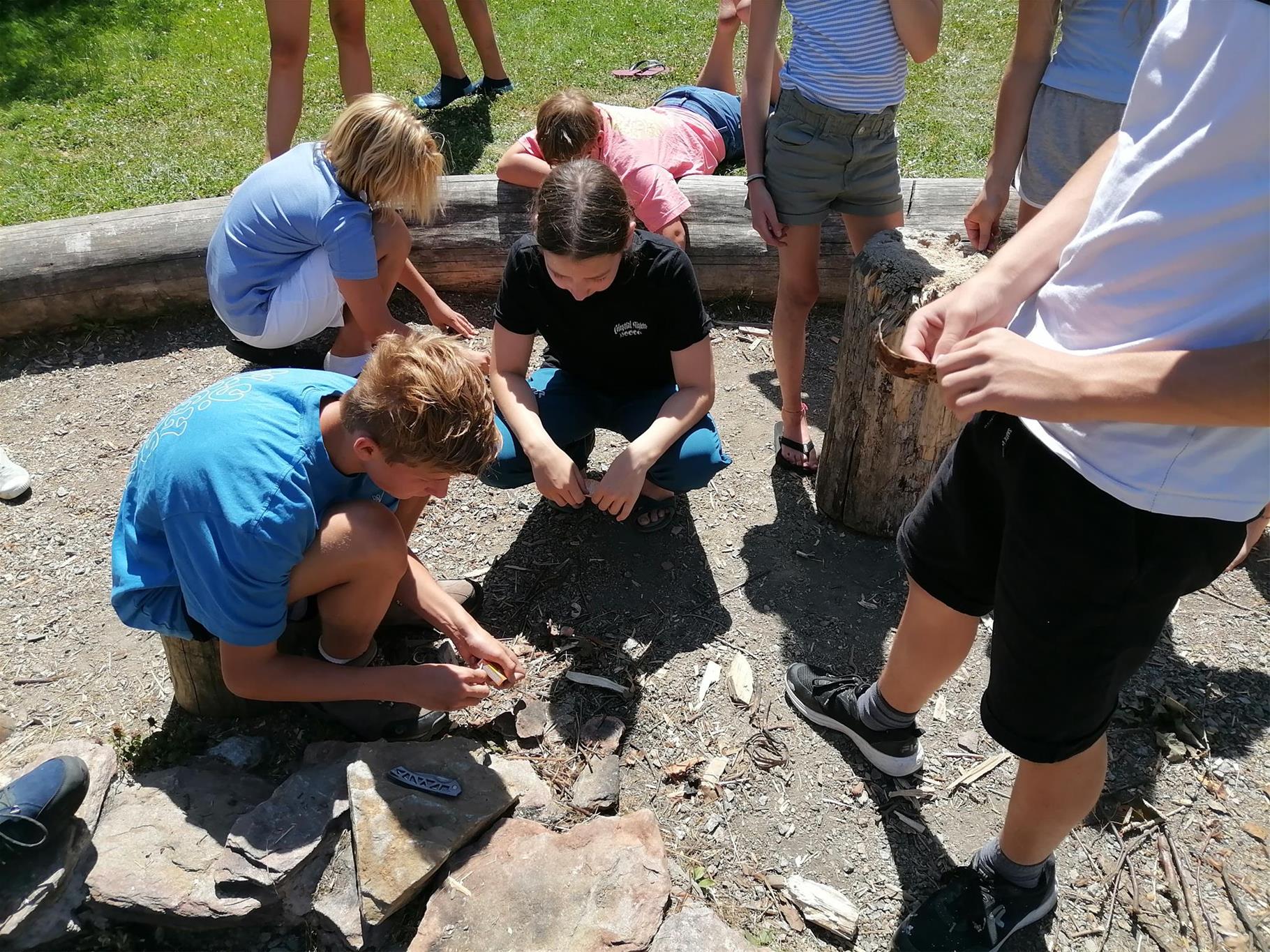 Jeder Tag der Woche hatte einen ganz speziellen Schwerpunkt. Der Feuerworkshop fesselte die Jungen Wilden besonders. Die Challenge mit Zundermaterial und Feuerstein den Funken überspringen zu lassen, versetzte so manche in völlige Euphorie. Der Geduldsfaden wurde dabei ordentlich auf die Probe gestellt. Unbeschreiblich, wenn die vorbereiteten Flugsamen, trockenen Äste und die aufgeraute Birkenrinde plötzlich zu qualmen begannen! Wow, da wurden Energien der Freude entladen.