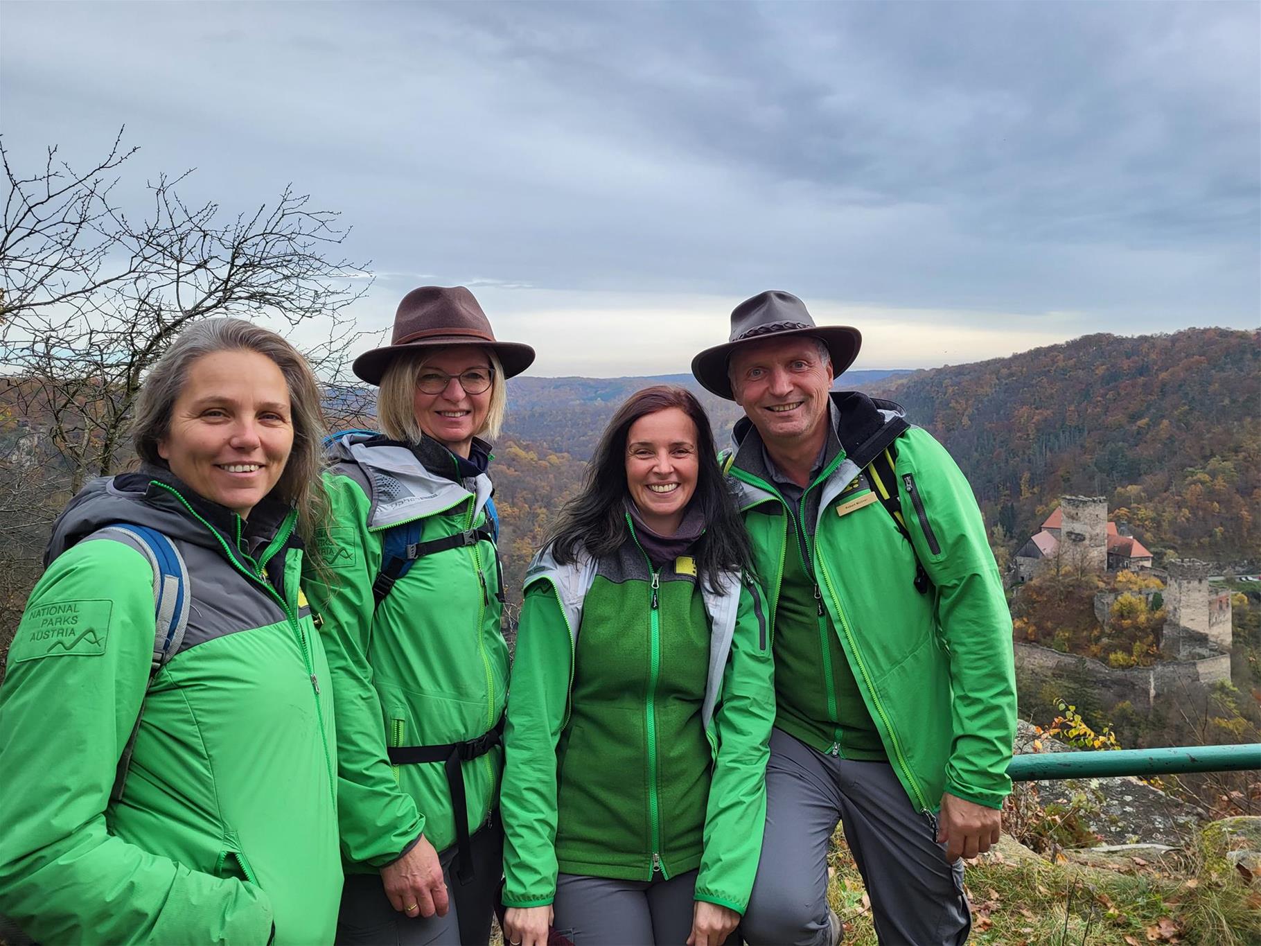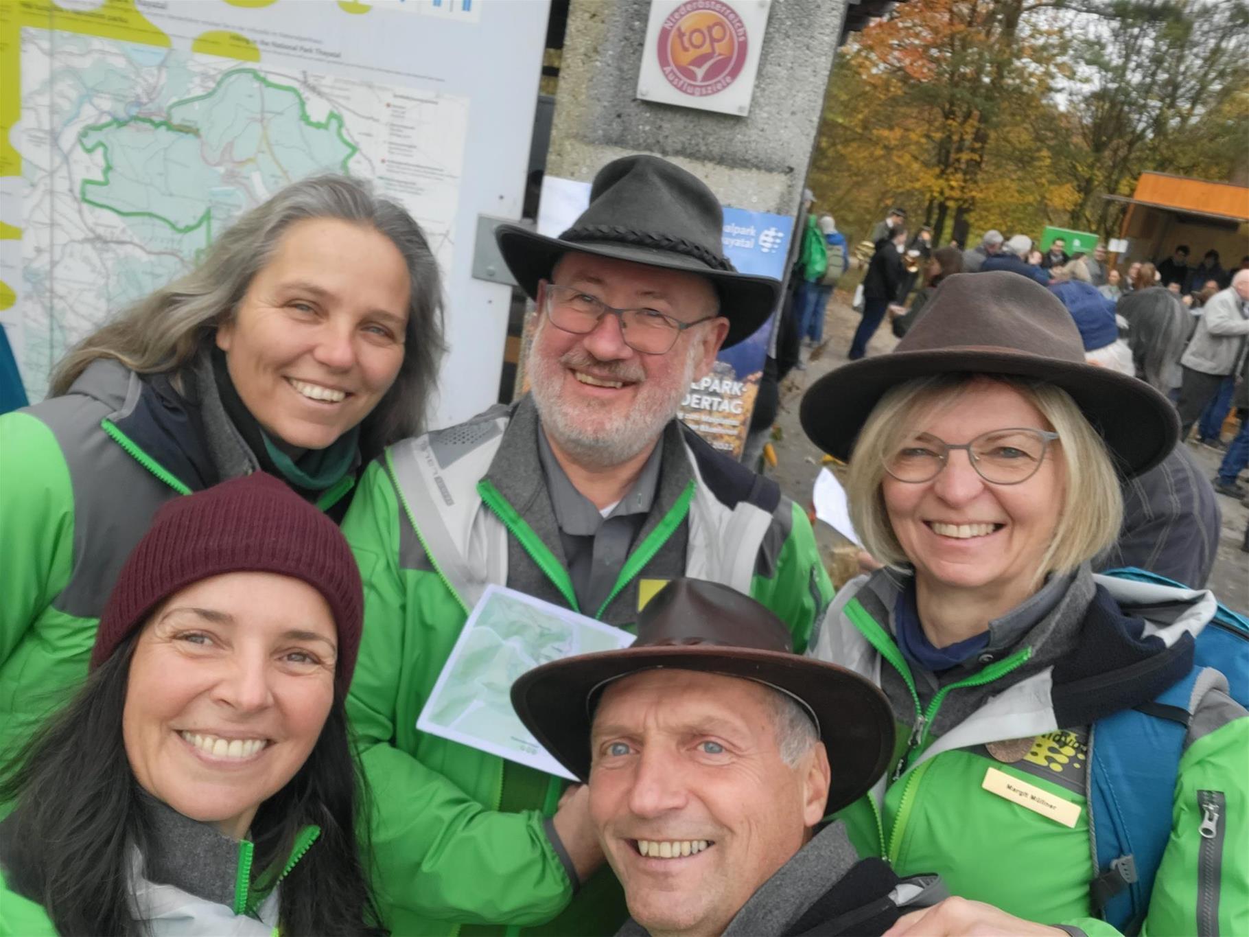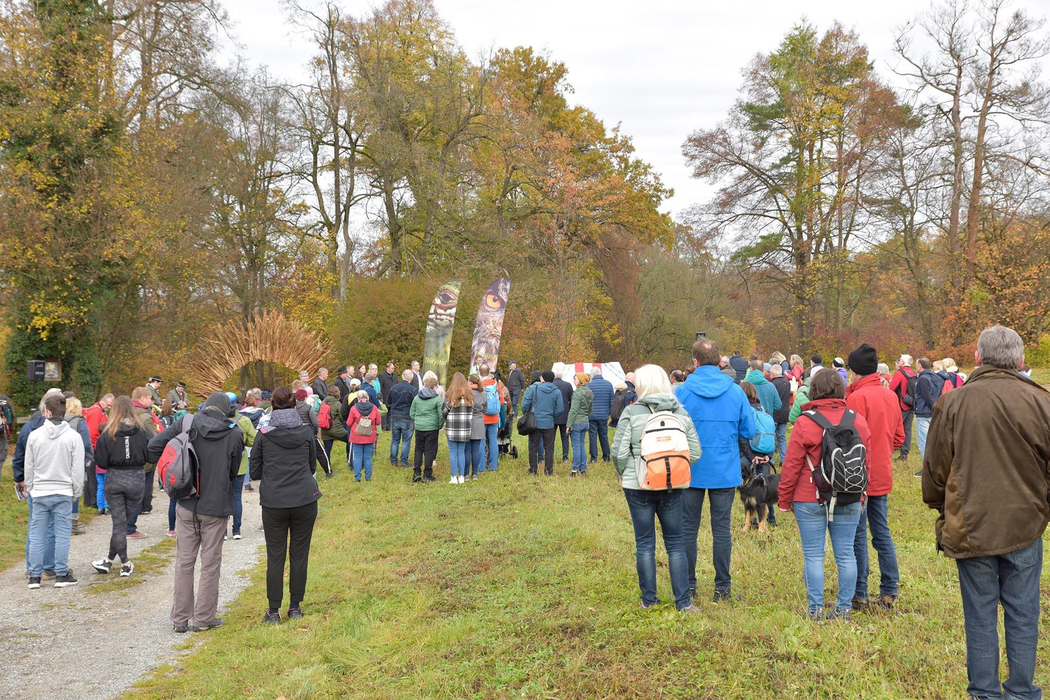 Rund 200 Gäste genossen die Festtagsstimmung und das Wandern am 26. Oktober. Die Tour führte vom Nationalparkhaus durch den farbenprächtigen Herbstwald hinunter nach Hardegg und anschließend hinauf auf das Max-Plateau mit einer wunderschönen Aussicht auf Burg und Stadt Hardegg. Am Beginn der Tour wurden beim Nationalparkhaus das "LANDeplatzl" durch Abg. z. NR Irene Neumann-Hartberger und ein neues Wildnisportal durch LAbg. Richard Hogl eröffnet.