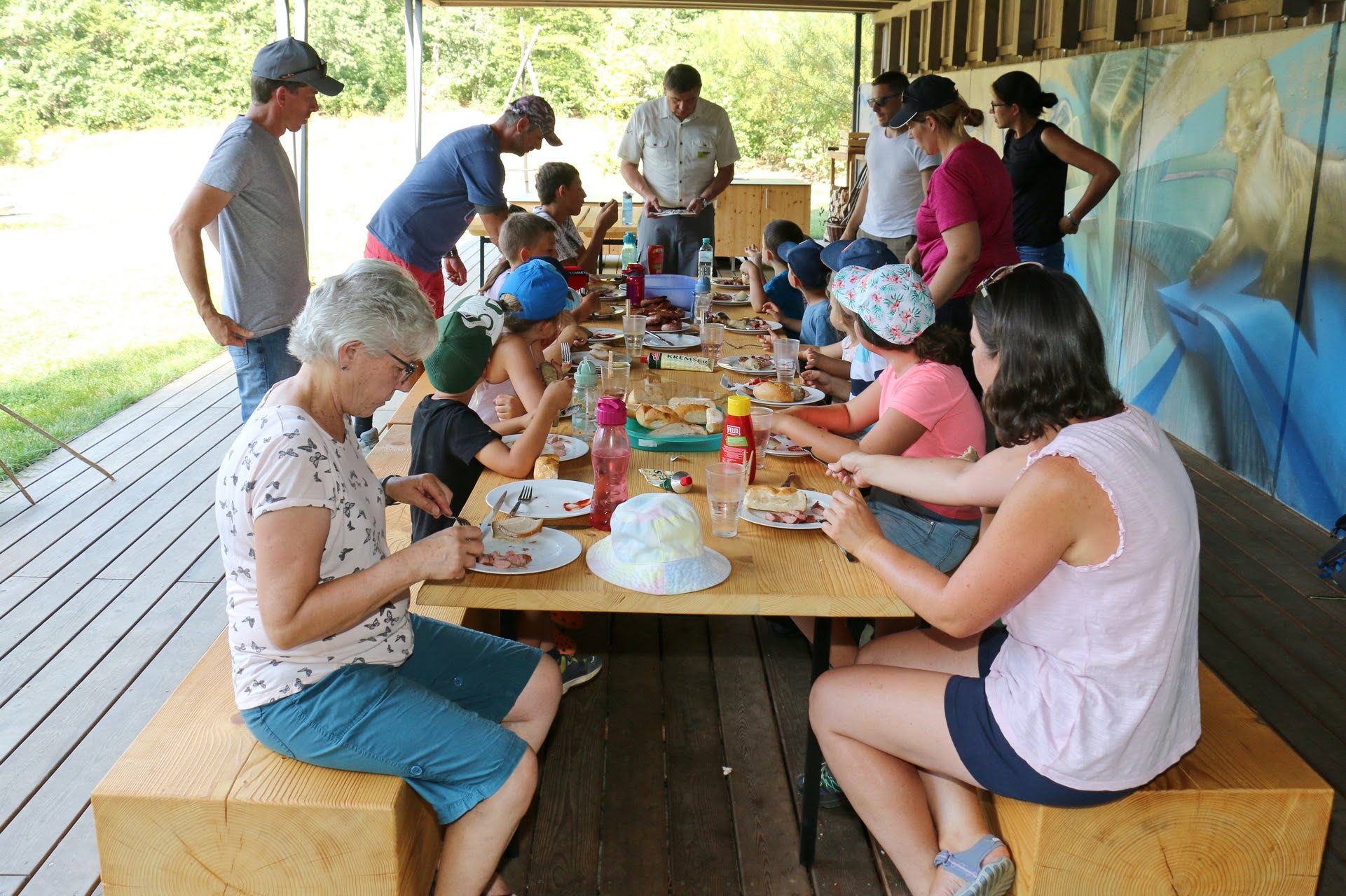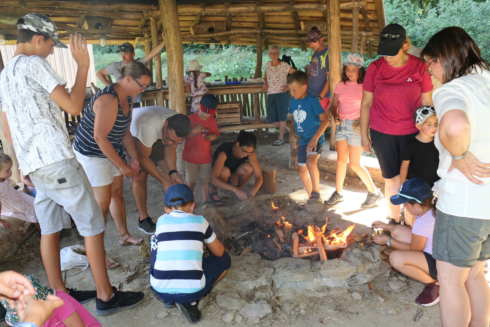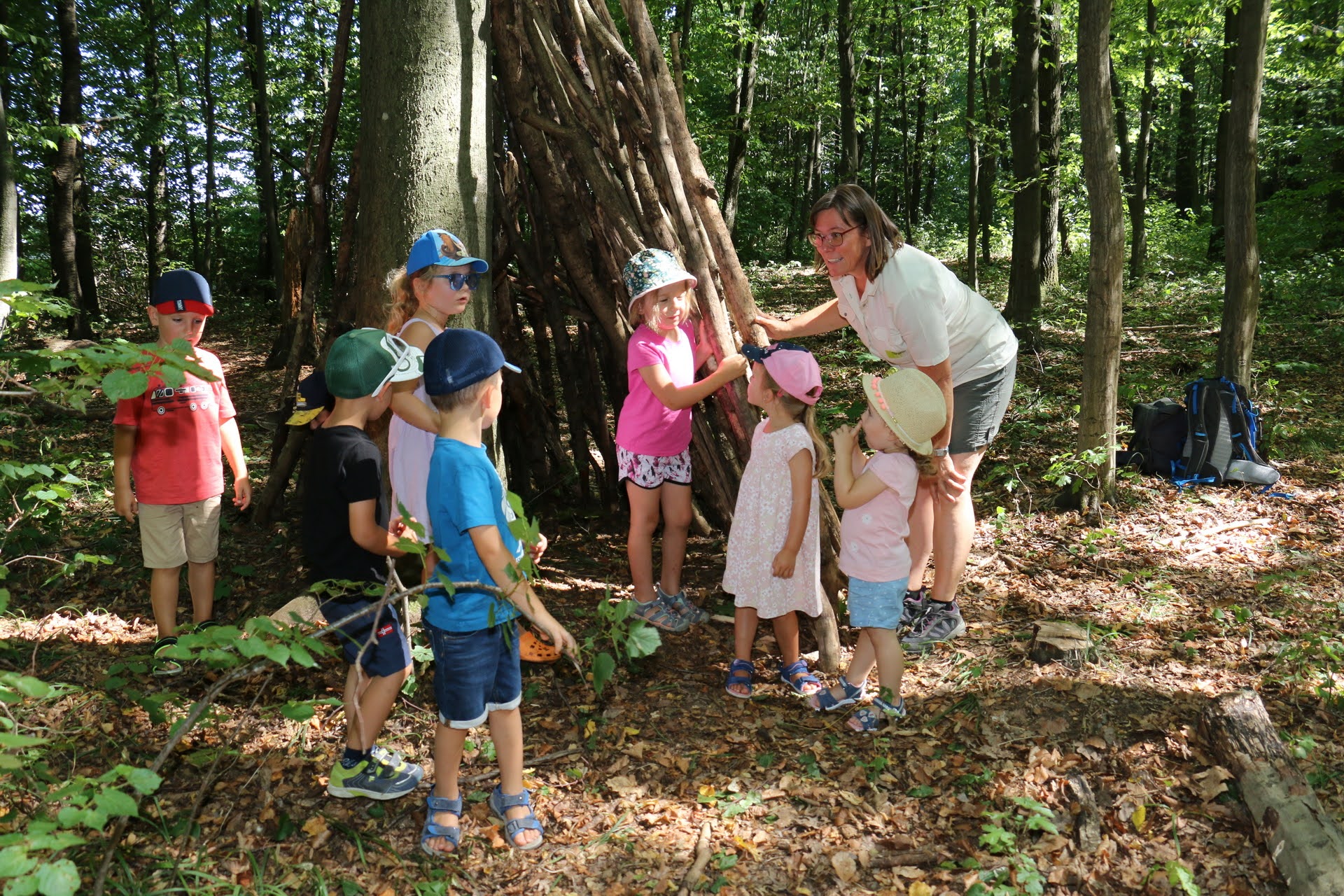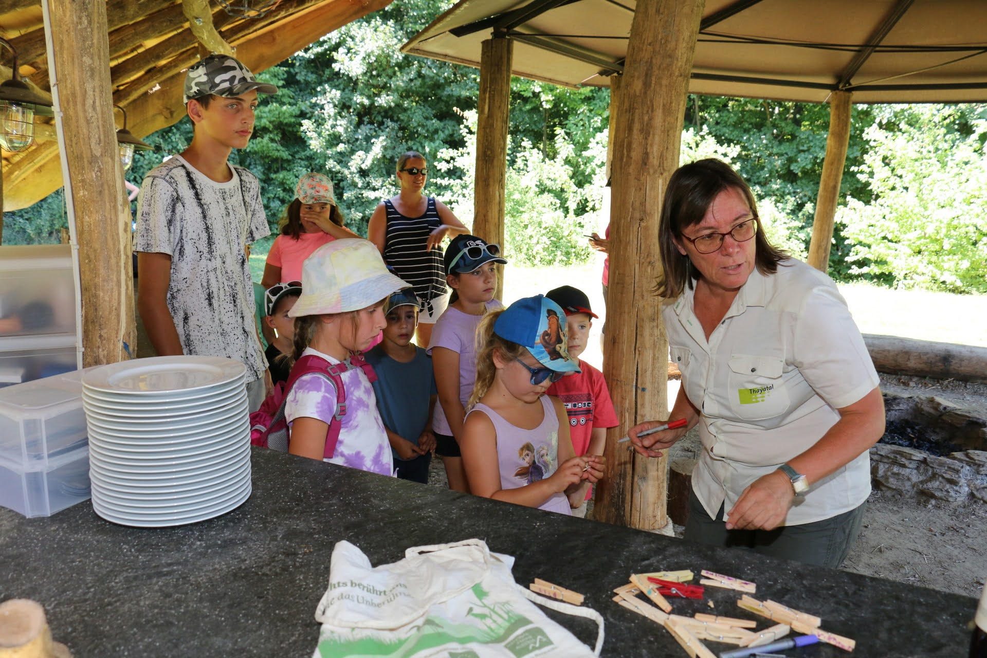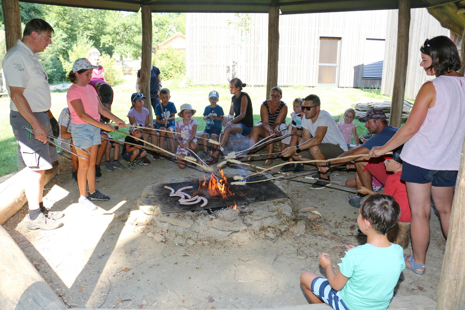 Wie kannst du in der Wildnis überleben? Wie entfachst du ein Feuer ohne Papier und Feuerzeug? Oder woher bekommst du Trinkwasser? Gemeinsam mit unseren Rangern streiften am 5. August 15 Kinder aus der Gemeinde Retzbach durch den wilden Nationalparkwald, versuchten diese Fragen zu lösen und auch gleich selbst auszuprobieren. Um für eine mögliche Übernachtung vorbereitet zu sein, bauten die jungen Besucher einen Unterschlupf aus Ästen und Zweigen, der auch sofort stolz besiedelt wurde. Am Lagerfeuer, das die kleinen Outdoorprofis nur mit Laub, Distelhaaren, trockenem Gras und Feuerstahl entfachten, gab es dann zum Abschluss Steckerlbrot und Grillwürstel.