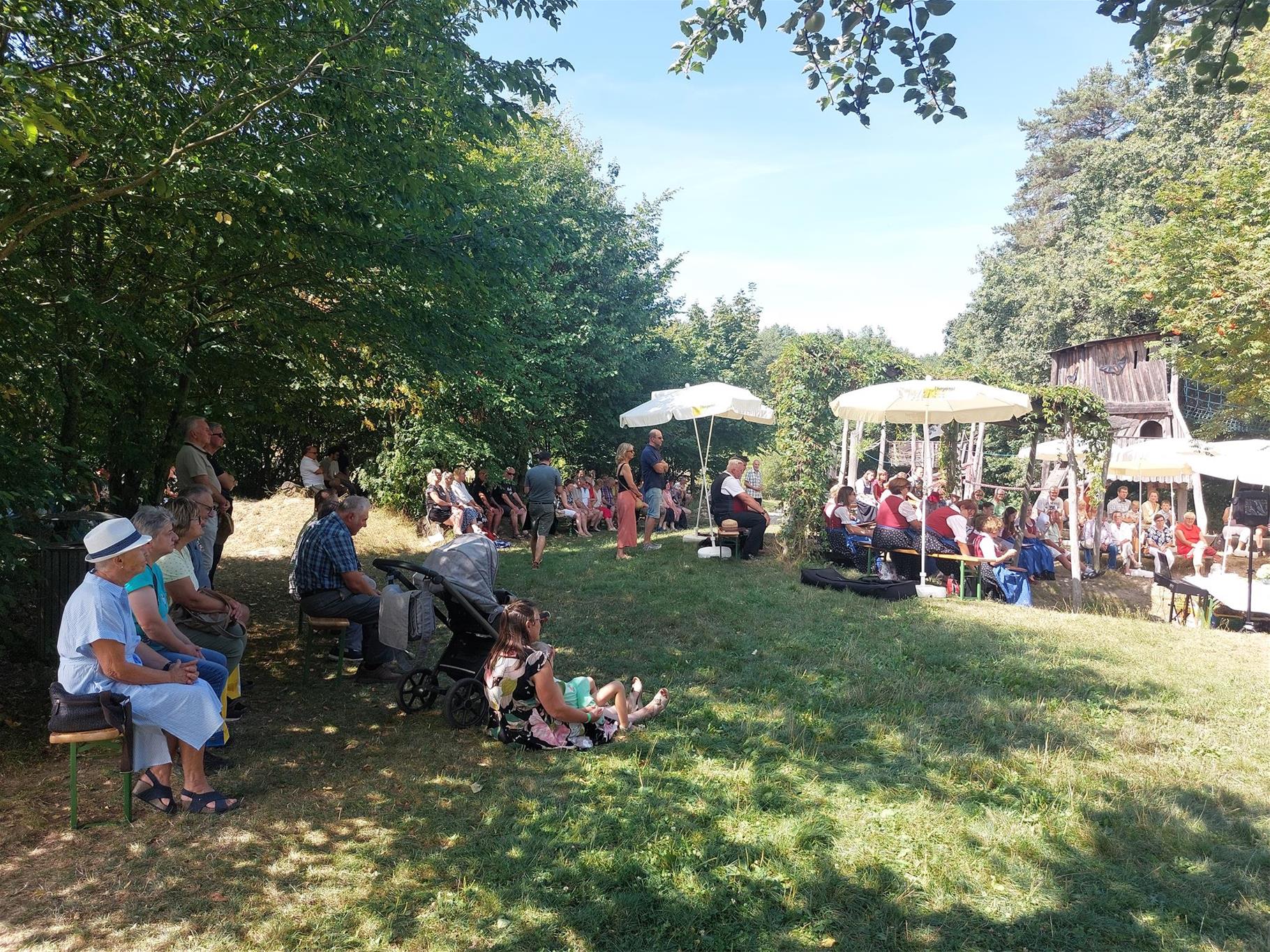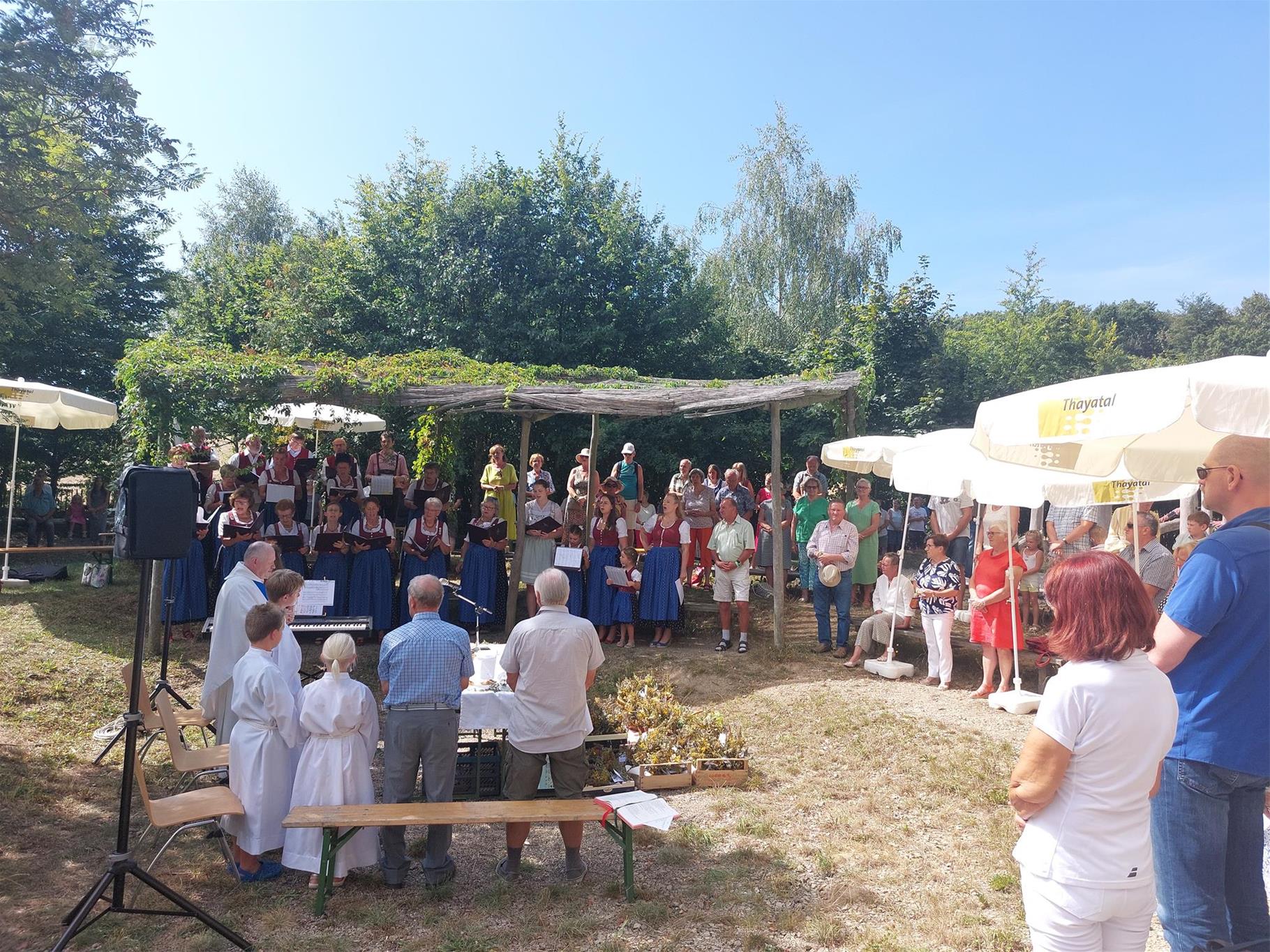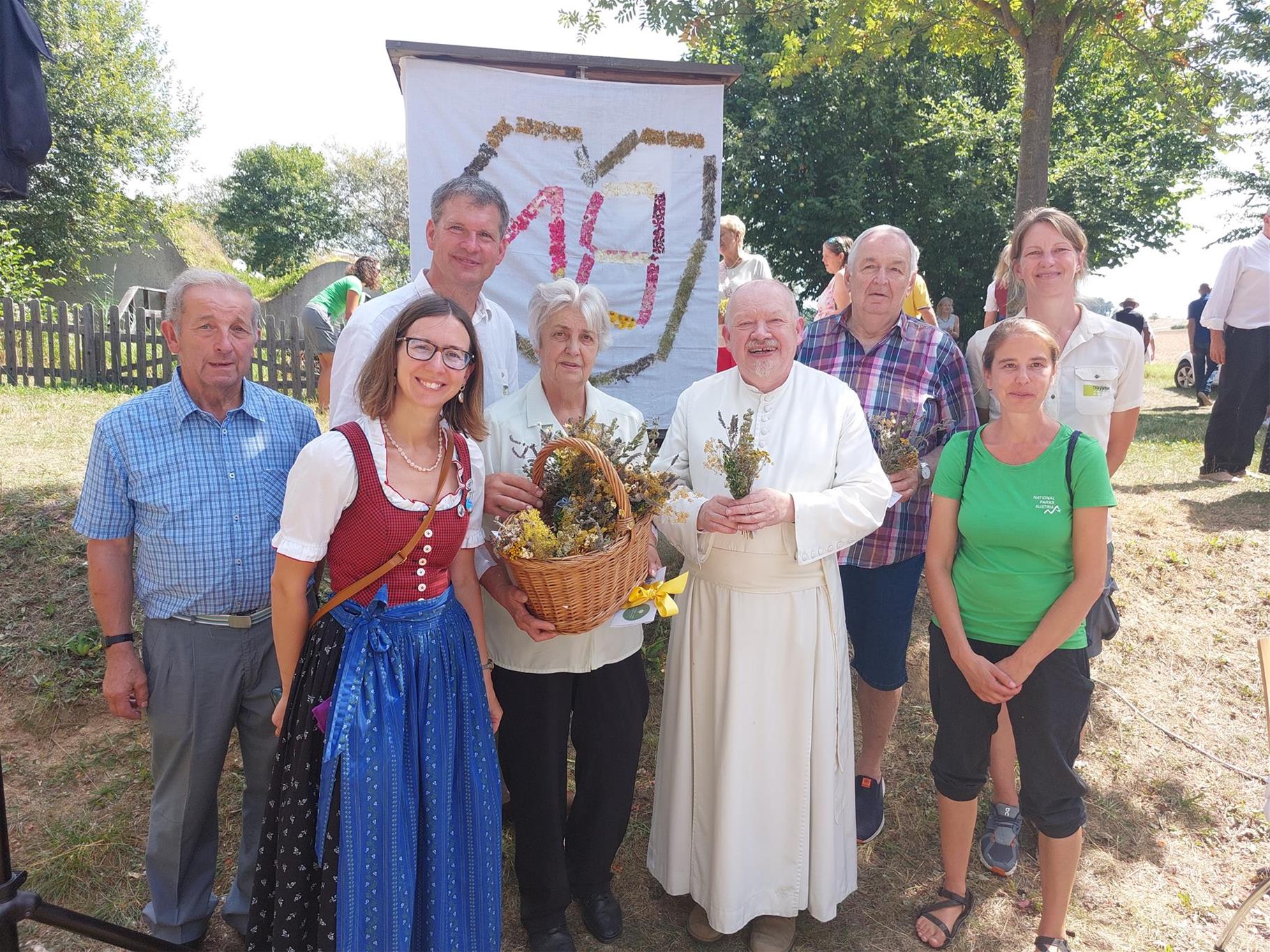 Höhepunkt der Veranstaltung bildete die Feldmesse mit Kräuterpfarrer Benedikt und der Singgruppe Hardegg. Der Predigt und der Kräuterweihe im Anschluss an die Messe wohnten um die 160 Leute bei! Wer das Ambiente beim Nationalparkhaus mit der ergreifenden Untermalung durch die Singgruppe Hardegg und die berührenden Worte von Benedikt Felsinger je erlebt hat weiß, warum der Andrang zu dieser Messe so groß ist. Im Anschluss an die Kräuterweihe und die Verteilung der Kräutersträuße sorgten der ortsansässige Gastronom und regionale Schmankerl der Familie Schadn für das leibliche Wohl. Für musikalische Untermalung und gute Stimmung sorgte das Merkersdorfer Bläserquartett "Kletz'n Musi".