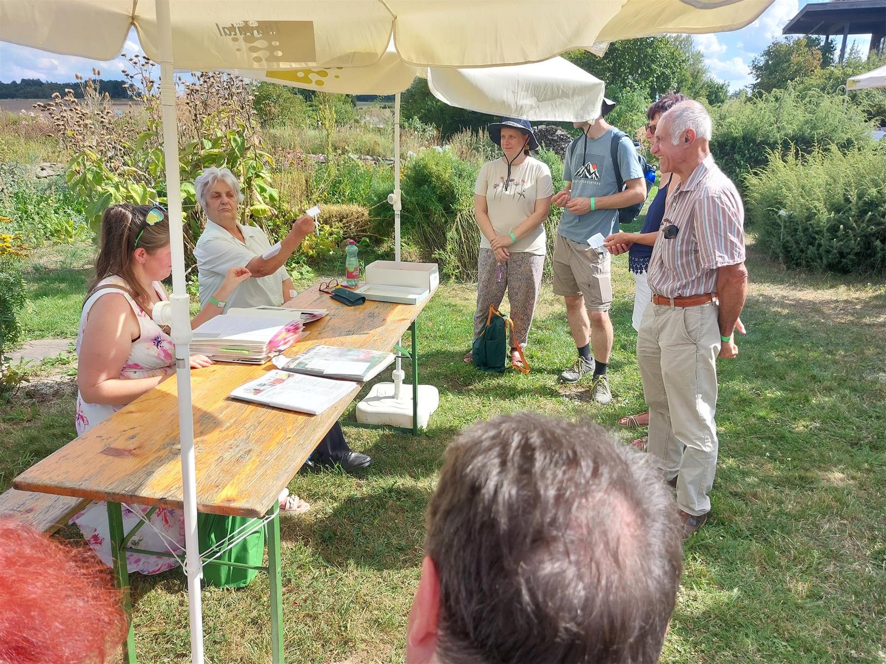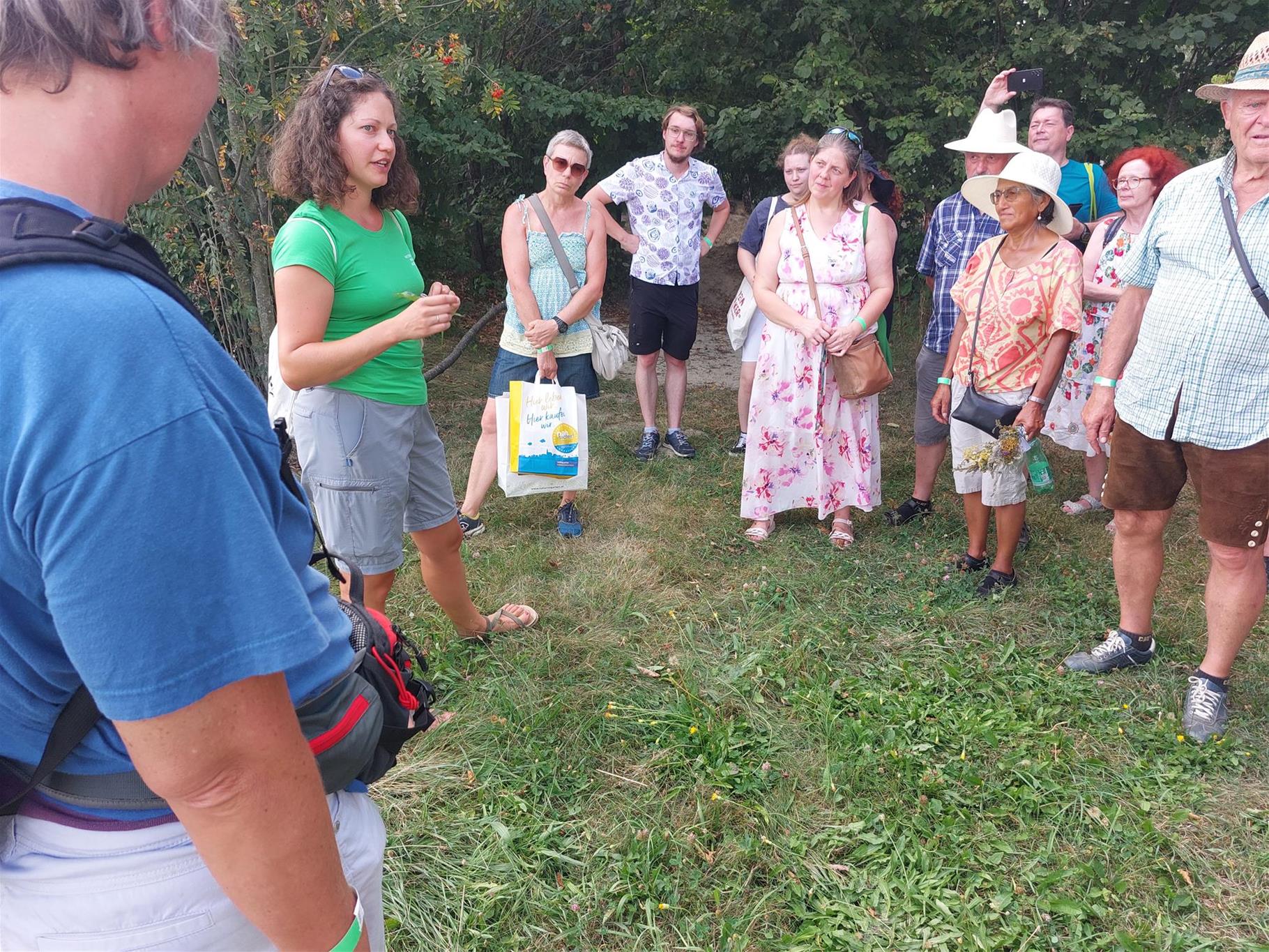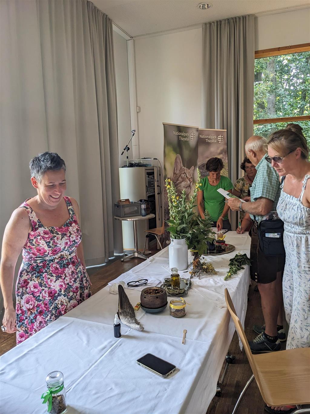 Der Tag startete mit einer morgendlichen Kräuterwanderung zum Aussichtspunkt mit Ausblick auf Hardegg. Mehr als 20 Teilnehmer und Teilnehmerinnen kamen von nah und fern um neues Kräuterwissen und Kräutergeschichten von Kräuterhexe Helga Donnerbauer und Rangerin Agnes Kläring zu erfahren. Manche Wissensdurstige waren so begeistert, dass sie im Laufe des Tages fast alle Programmpunkte in Anspruch nahmen.