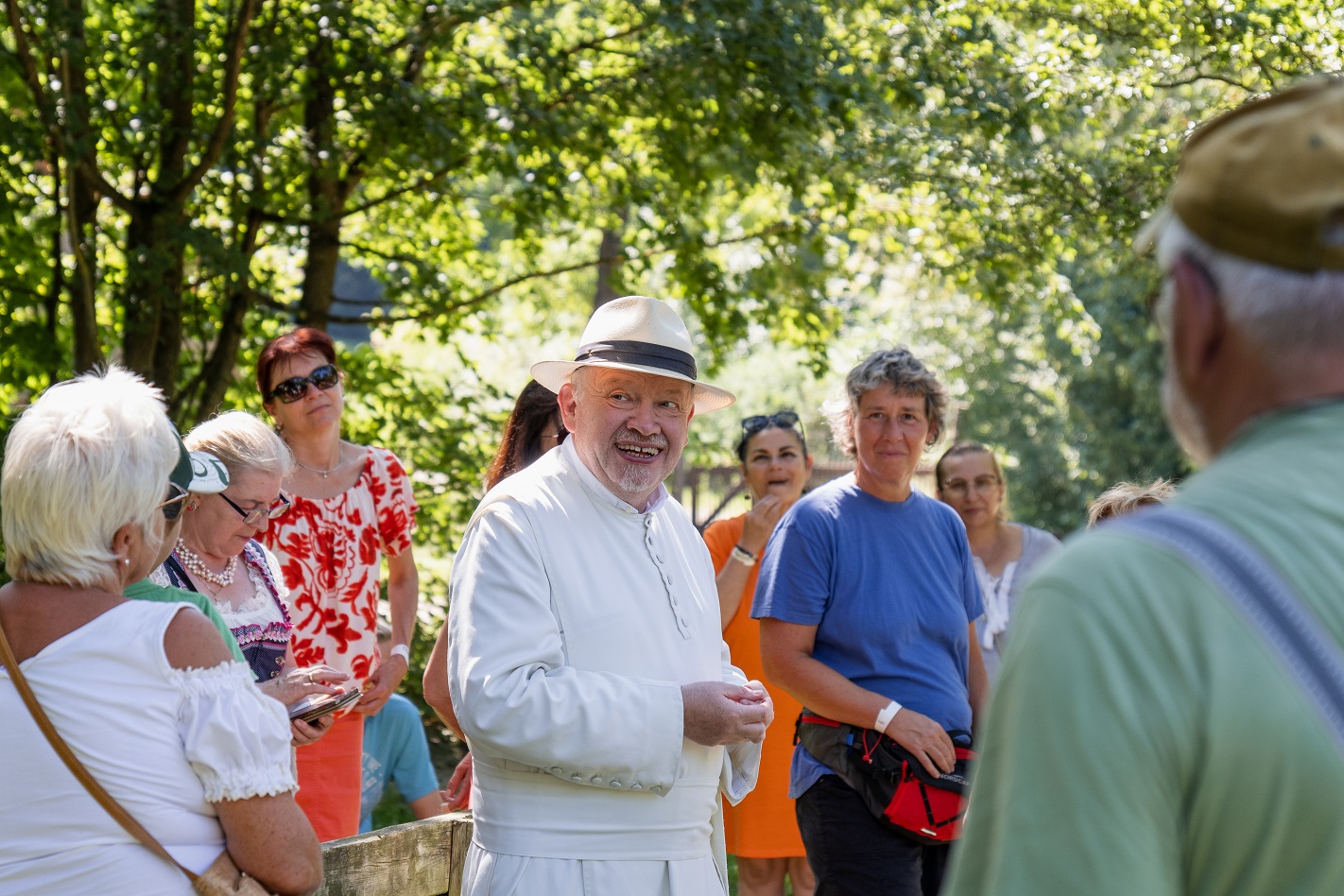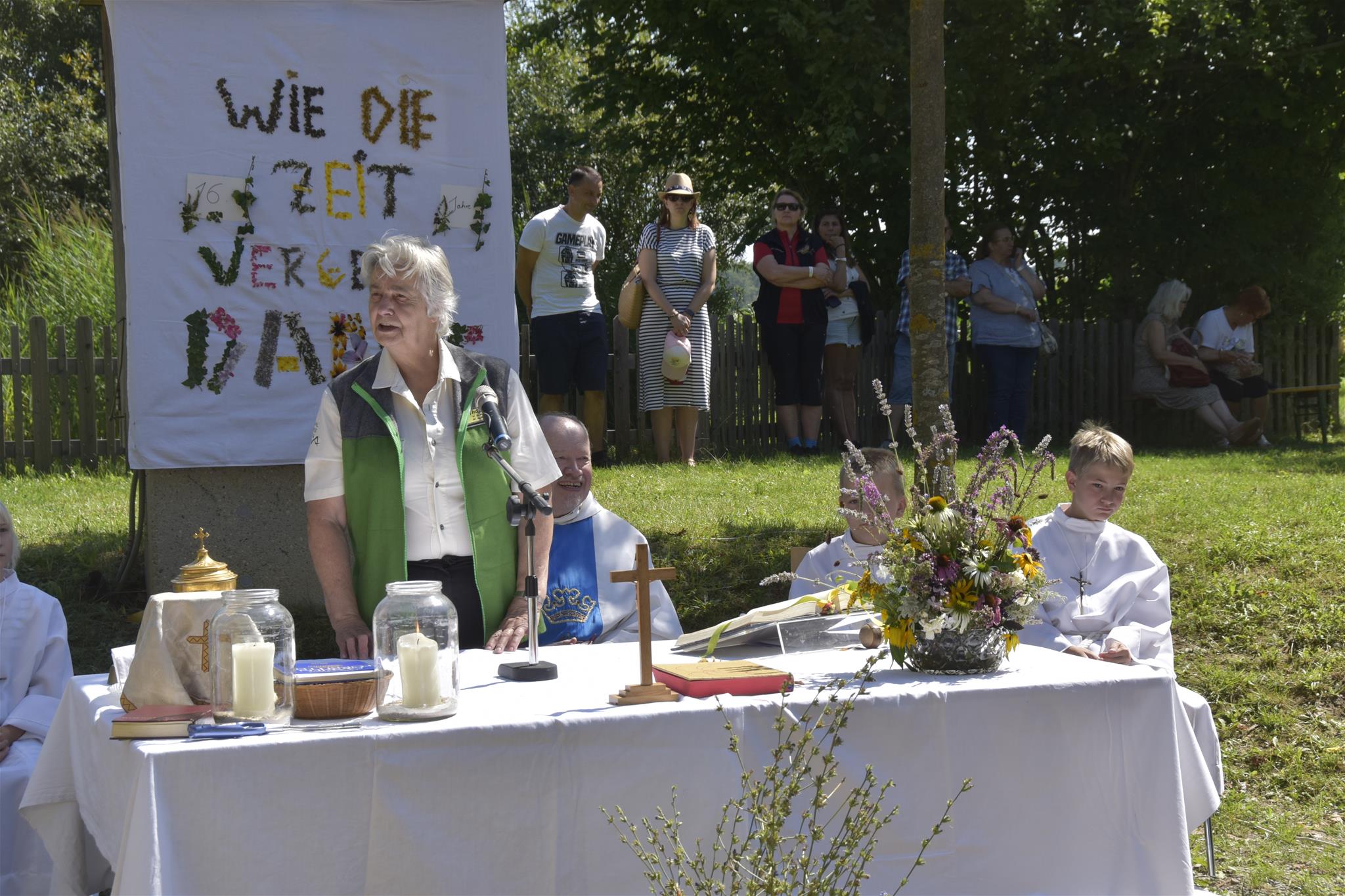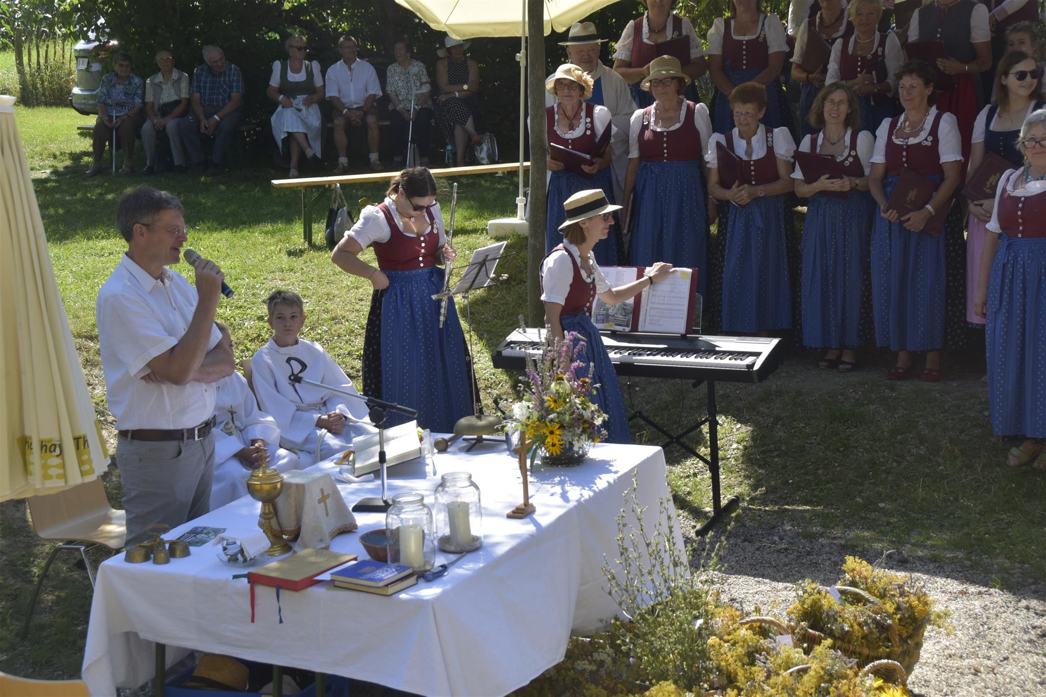 Kräuterpfarrer Benedikt hatte sich von seinem Reha-Aufenthalt einen Tag Urlaub erbeten, um mit den Besuchern die Feldmesse mit anschließender Kräuterweihe zu feiern. Um die 160 Personen hatten sich bei der Messe hinterm Nationalparkhaus versammelt, lauschten der Predigt und sangen gemeinsam mit dem Chor der Hardegger Singgruppe.