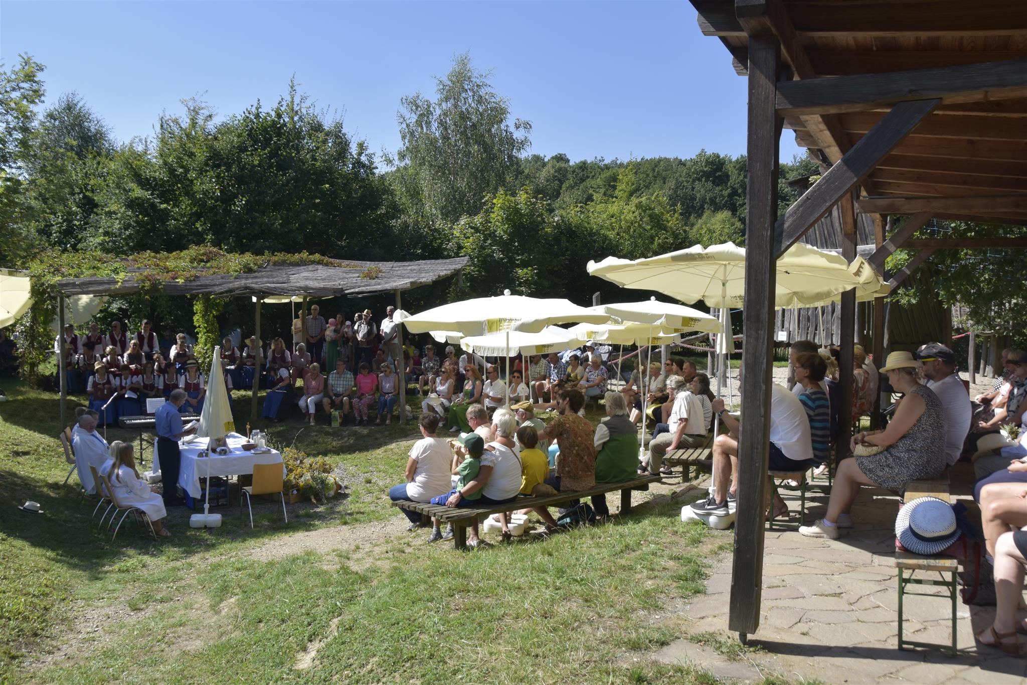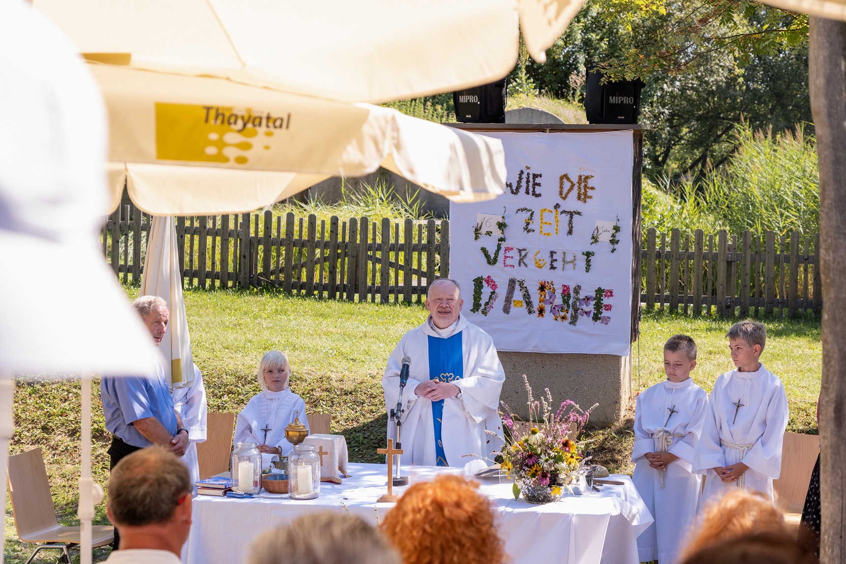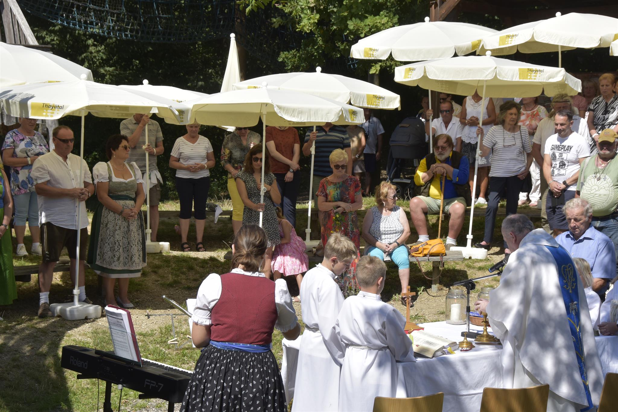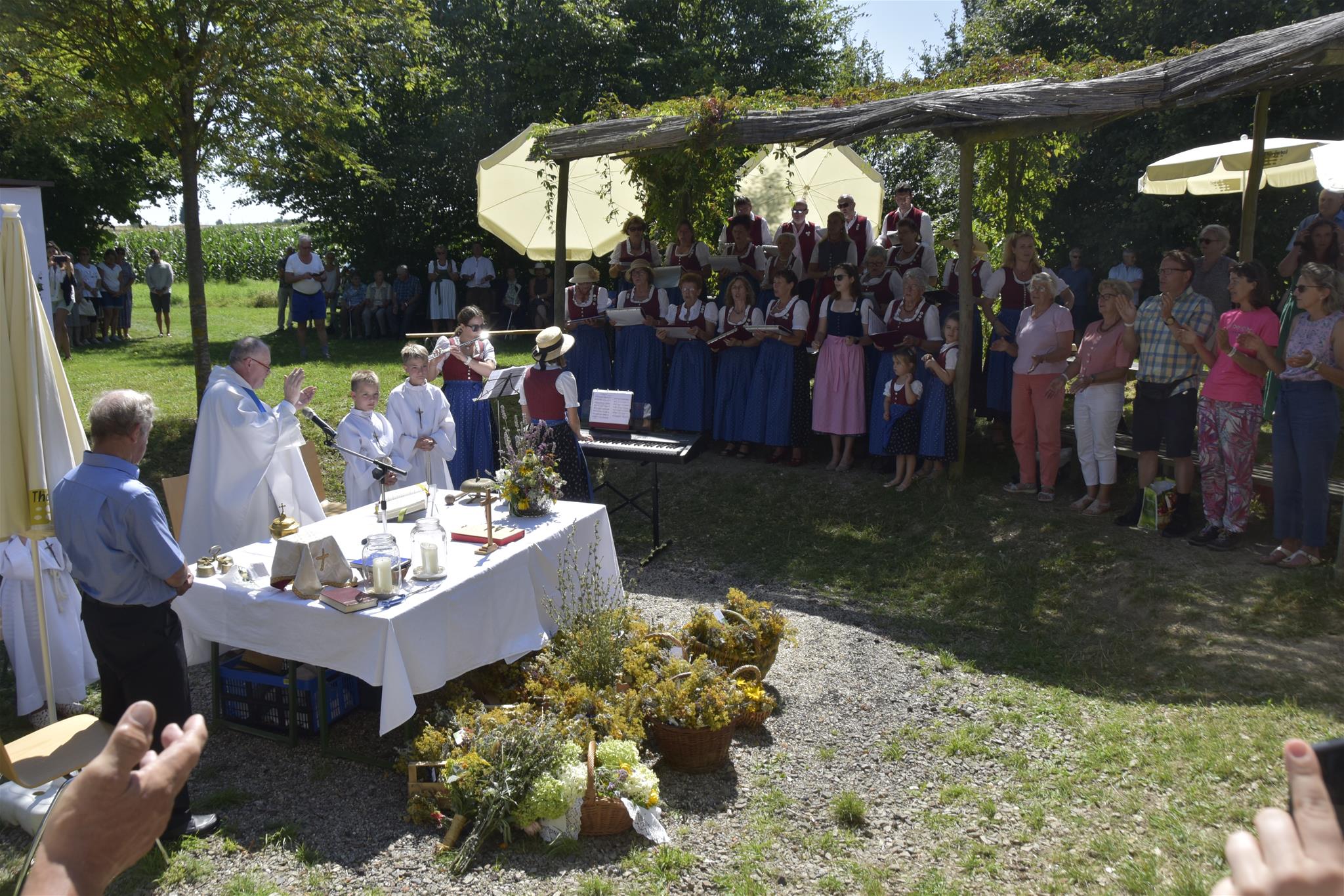 Kräuterpfarrer Benedikt hatte sich von seinem Reha-Aufenthalt einen Tag Urlaub erbeten, um mit den Besuchern die Feldmesse mit anschließender Kräuterweihe zu feiern. Um die 160 Personen hatten sich bei der Messe hinterm Nationalparkhaus versammelt, lauschten der Predigt und sangen gemeinsam mit dem Chor der Hardegger Singgruppe.