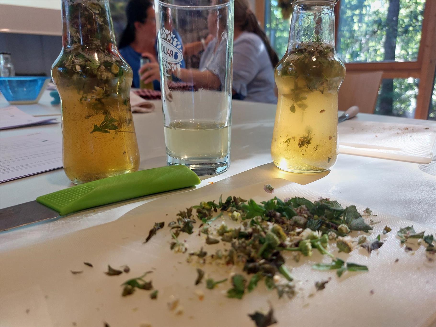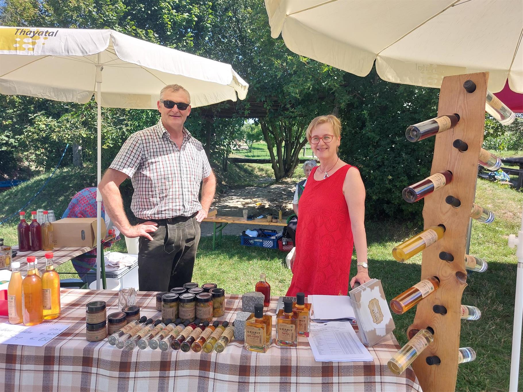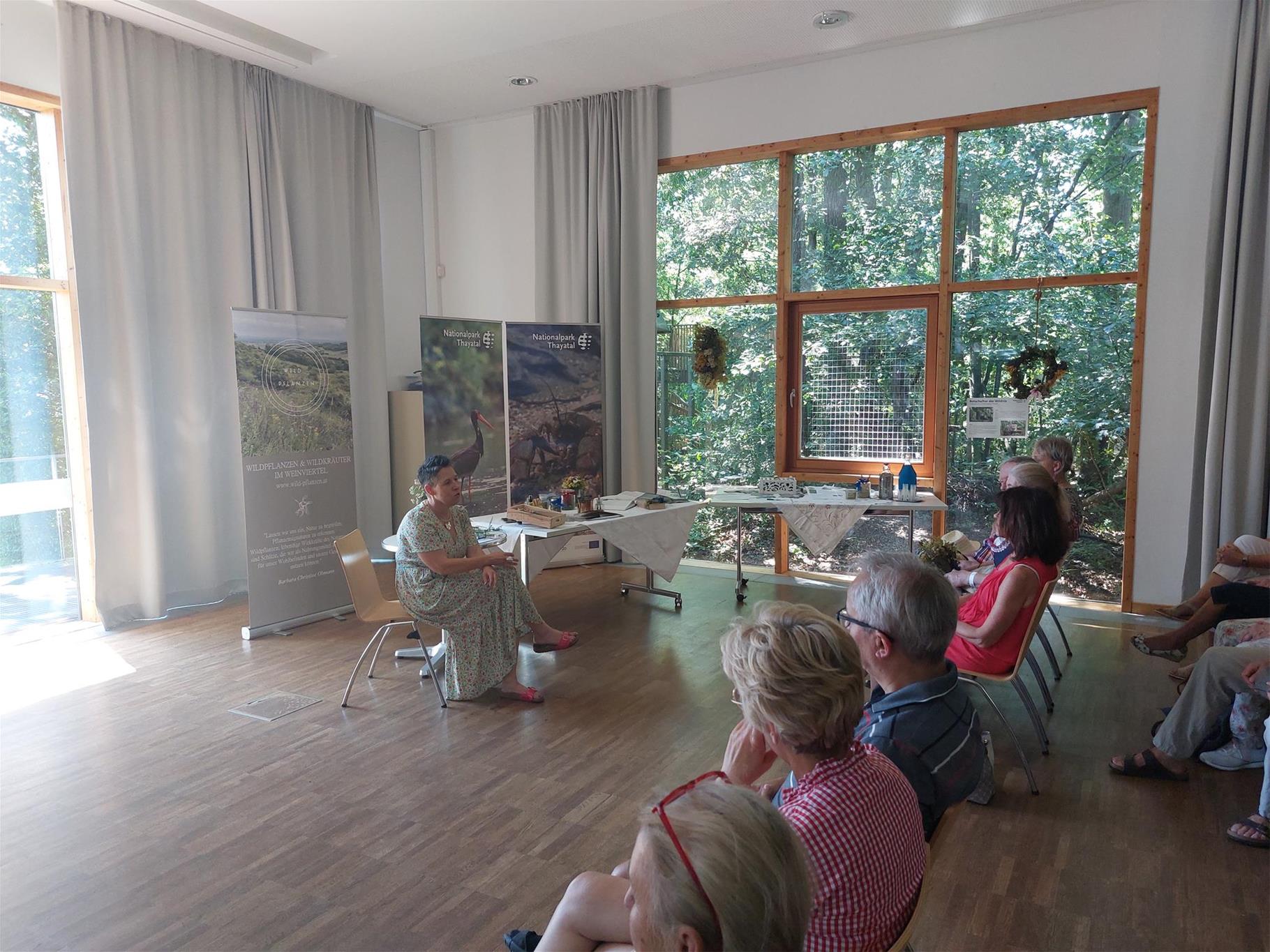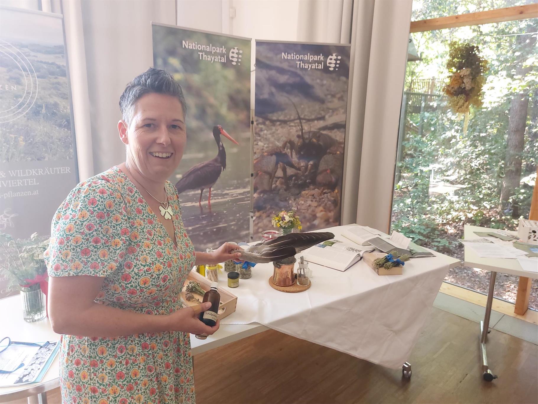 350 bis 400 Besucher und Besucherinnen kamen an diesem sonnige Augusttag zum Nationalparkhaus um mit dem Nationalpark und dem Verein der Freunde der Heilkräuter den Höhepunkt im Kräuterjahr zu feiern. Bei schwungvoller musikalischer Begleitung durch das Merkersdorfer Blasmusikquartett Kletz'n Musi flanierten sie am Marktplatz, genossen die ausgezeichnete Verköstigung oder besuchten Vortrag, Workshop oder Kräuterwanderung. Manche waren so begeistert, dass sie von der morgendlichen Kräuterwanderung bis zur Wildkatzenschaufütterung um 16.30 Uhr keinen Programmpunkt auslassen wollten! Da hatten sie sich den erfrischenden Schluck einer Oxymel-Kostprobe beim vorletzten Programmpunkt redlich verdient! Auch die Kostproben bei Vorträgen & Wanderungen halfen, um das Gelernte auch zu verinnerlichen und die Wirkungen der Kräuter und Pflanzen gleich zu testen. "Der Duft der Schafgarbe als Kraut der Lebenskraft hat vielleicht dazu beigetragen, dass viele Besucherinnen und Besucher - es waren tatsächlich auch einige Männer dabei - bis zum Schluss durchgehalten haben," erklärt Barbara Obmann lächelnd. Sie freute sich über das rege Interesse an den vielen Details und Anwendungsbeispielen von denen Sie zur Schafgarbe berichtete.