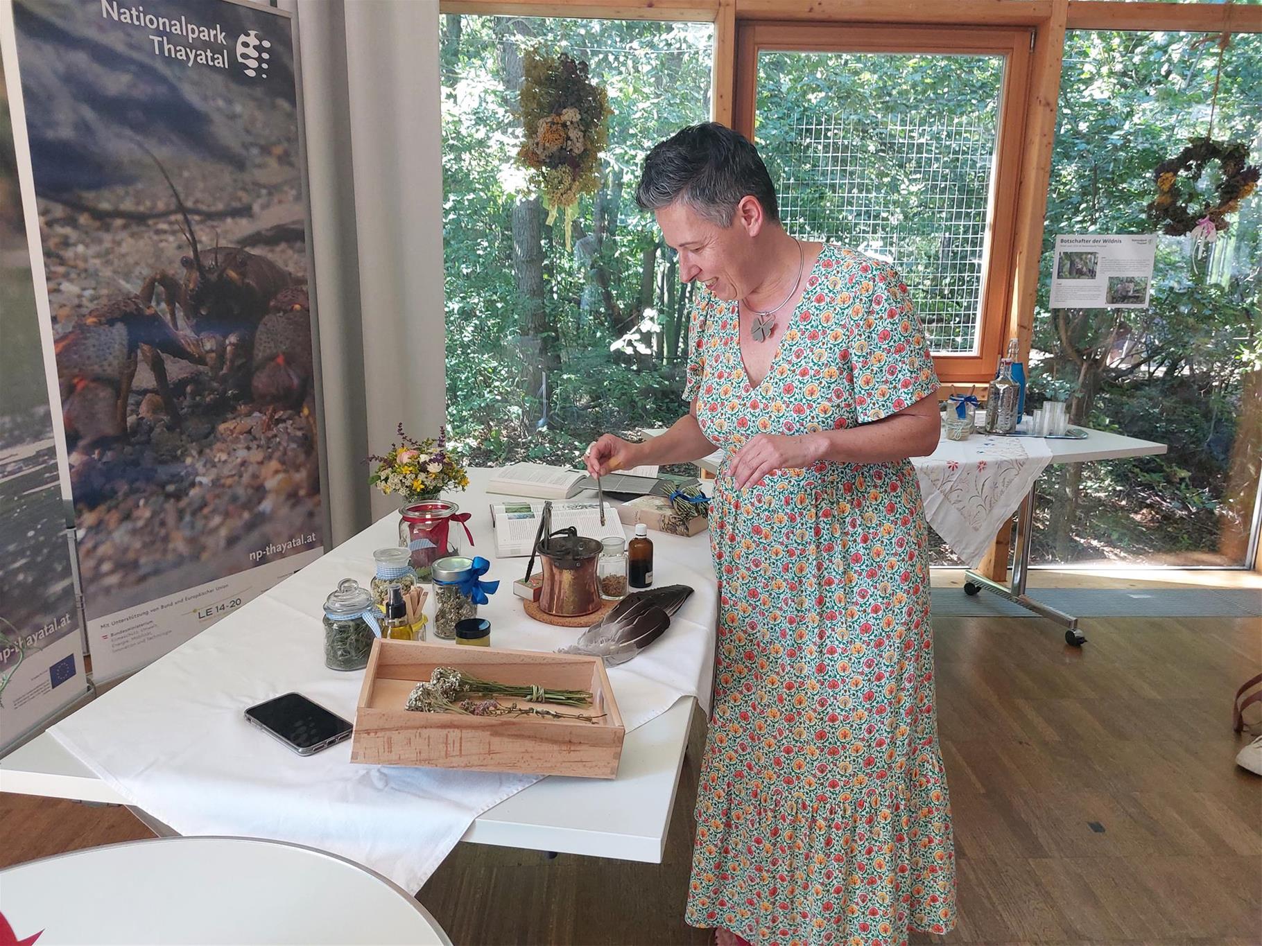 Bereits um 8.30 Uhr startete da Programm mit eine morgendlichen Kräuterwanderung. Helga Donnerbauer, Kräuterhexe und Nationalpark Rangerin, die das Kräuterfest seit dem Jahr 2007 organisiert, erzählte interessante und unterhaltsame Geschichten rund um die Wirkung der Heilkräuter.