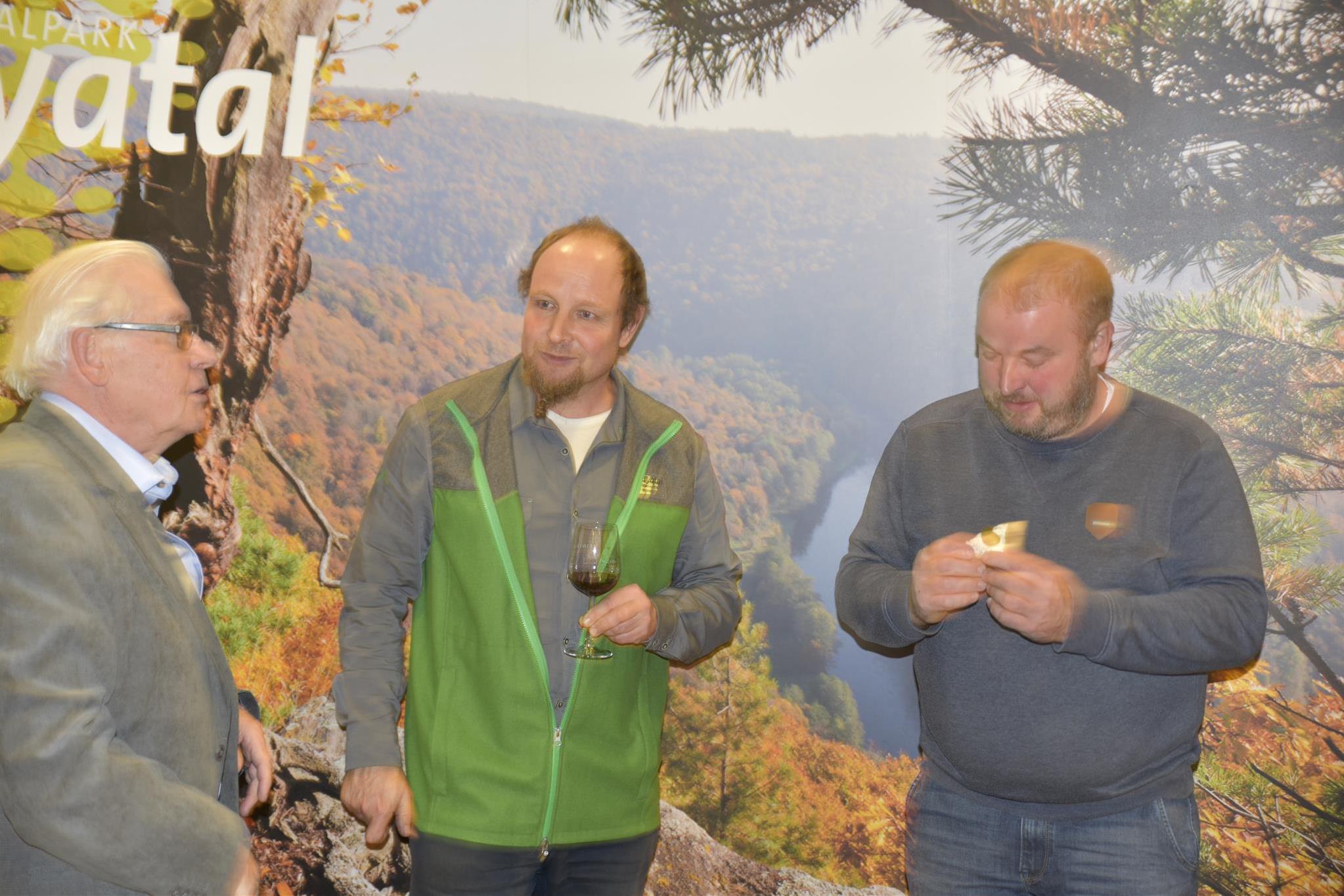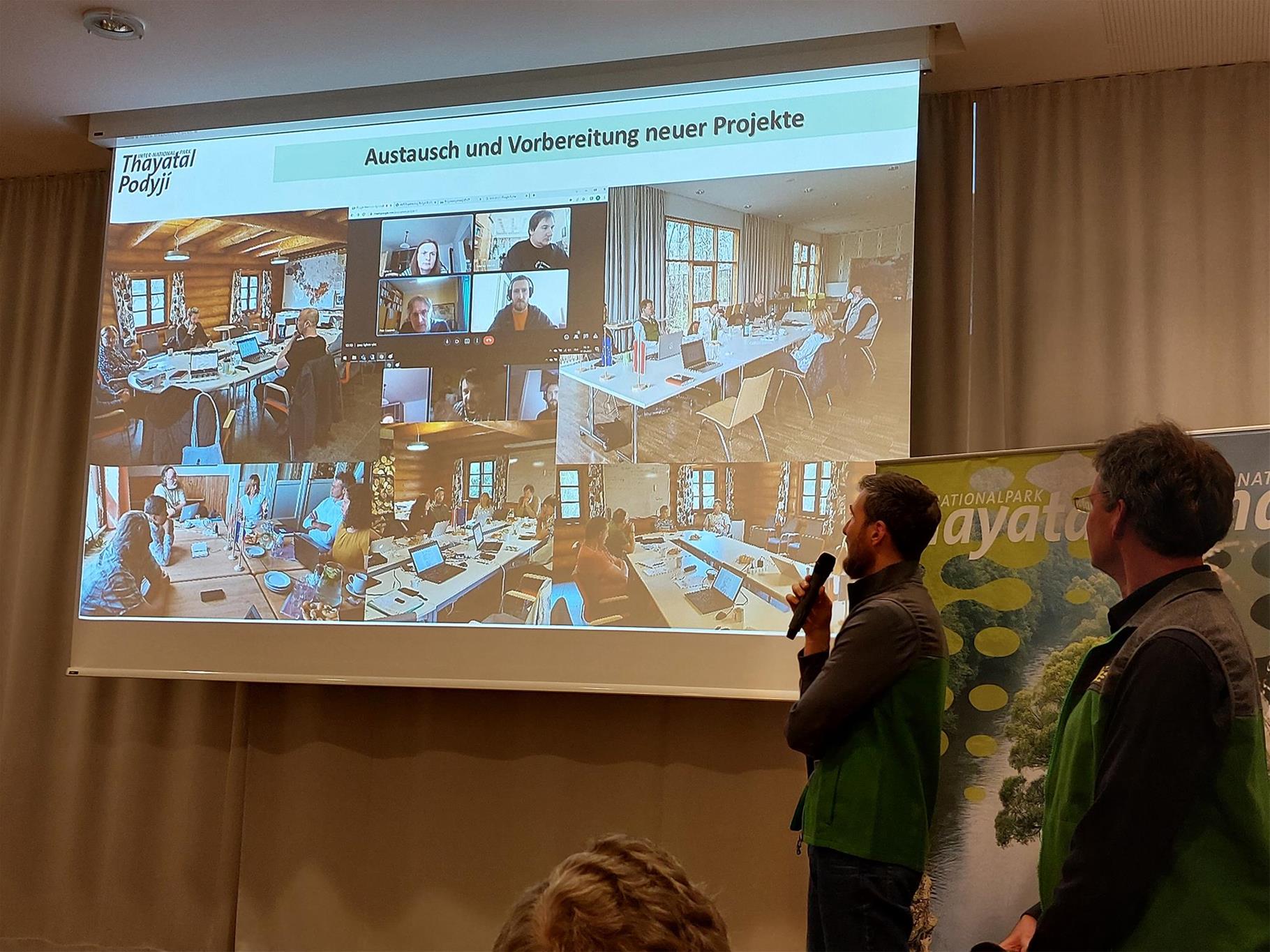 Direktor Christian Übl und David Freudl berichteten im Anschluss über die neue Brücke beim Einsiedler und die Erfolge der grenzüberschreitenden Zusammenarbeit. Denn entgegen der Wahrnehmung der befragten Wanderer wurden viele gemeinsame Aktivitäten gesetzt. Hardegg spielt bei der Anzahl der umgesetzten Interreg-Projekte in einer Liga mit Großstädten wie Linz. Herausragend ist die Umsetzung einer Hängebrücke von Österreich über die Thaya nach Tschechien. Die Brücke wird im Design der bereits bestehenden Hängebrücken in Tschechien umgesetzt. Die Fertigstellung der Brücke ist bis Ende des Jahres geplant. "Durch diese Brücke wird das gemeinsame Schutzgebiet des Thayatals auch beim Wandern grenzüberschreitend erfahrbar," freut sich Direktor Übl auf den neuen Rundwanderweg, der 2023 beide Nationalparks verbinden wird. Dass eine Brücke über die Staatsgrenze realisiert werden kann, zeugt nicht nur von einer guten Zusammenarbeit zwischen den beiden Nationalparks. Der Nationalpark schätzt auch die gute Zusammenarbeit mit der Stadtgemeinde Hardegg.