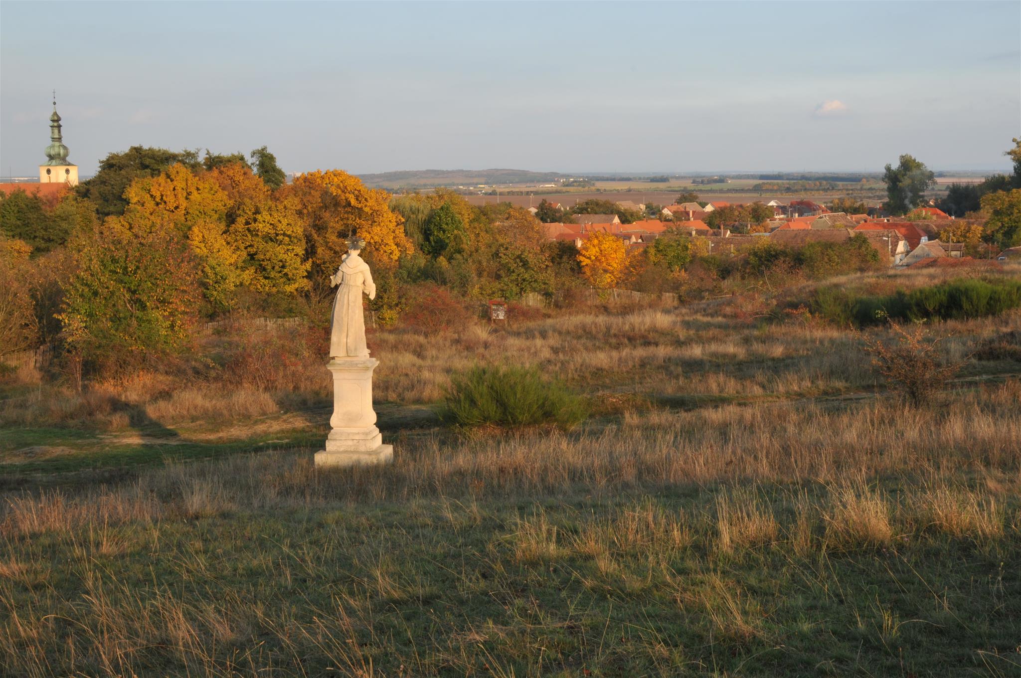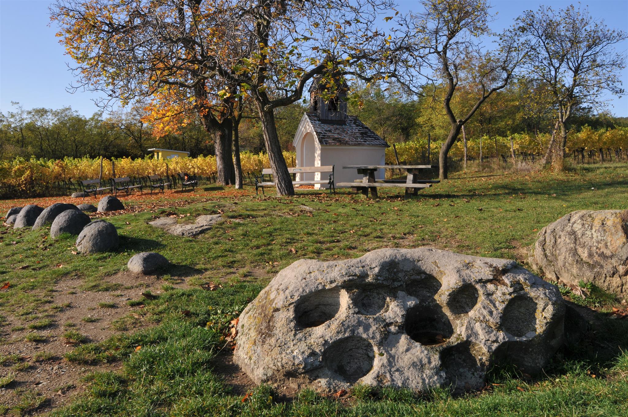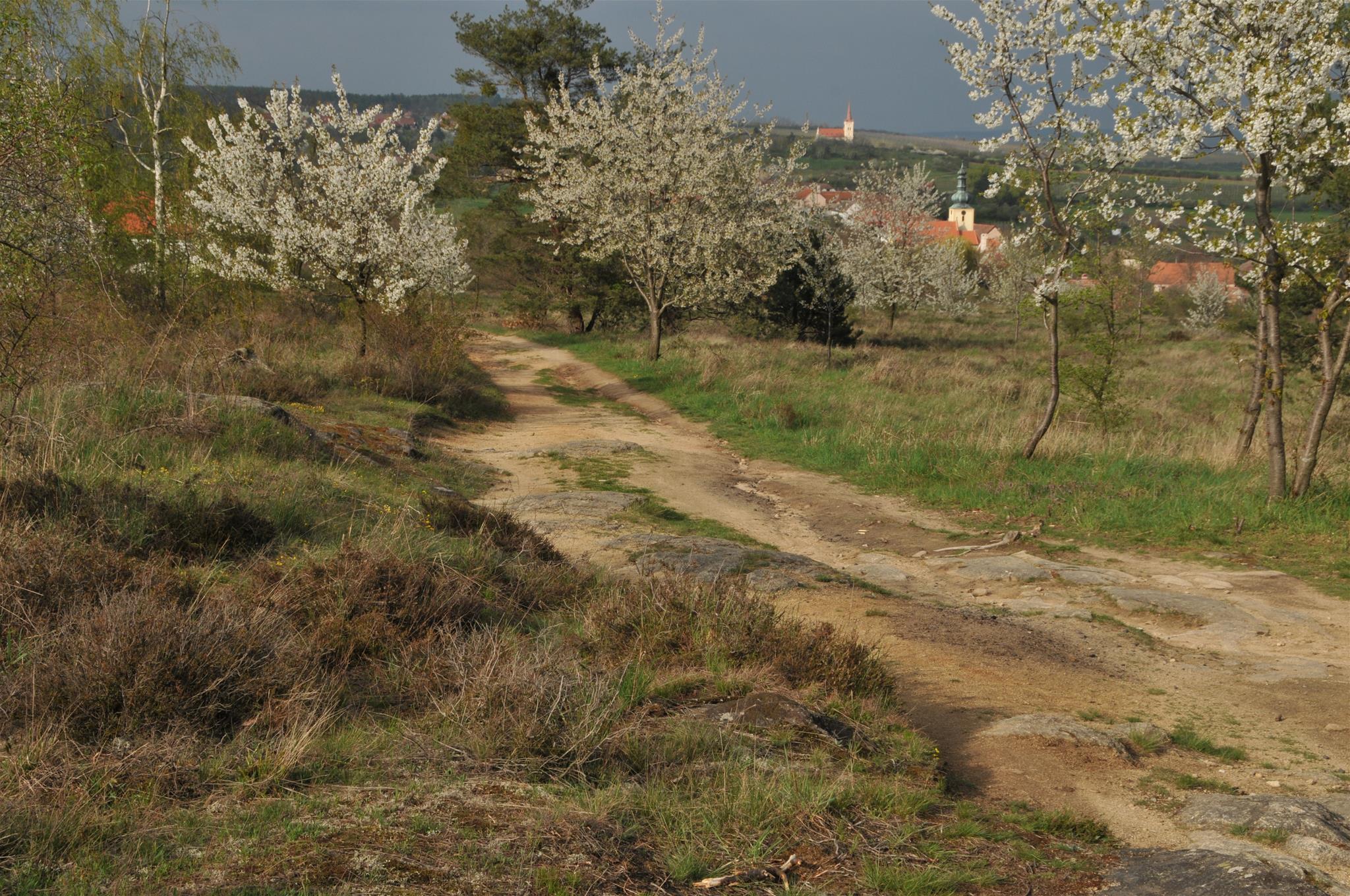 An der Straßenkreuzung Richtung Mitterretzbach-Hardegg links halten und über den alten Anger gehen. Nach etwa 1 h Wanderung durch die Weinberge, erreicht man den Hl. Stein, wo sowohl Weinschenke als auch Aussichtsterrasse mit malerischen Blicken auf die Wanderer warten. Von hier lässt sich in der Ferne bereits Hnanice und das etwas außerhalb gelegene Hotel Vinice sehen, wo es dann bergab zur Thaya geht, immer der gelben Markierung des E 8 folgend.