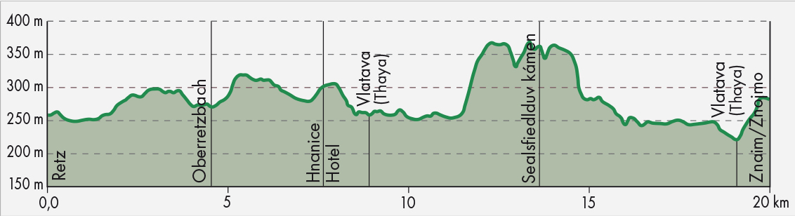 Retz Hauptlatz - auf dem Wanderweg E 8 mit der gelben Markierung in Richtung Hl. Stein - bei der Straßenkreuzung Richtung Mitterretzbach-Hardegg links halten - über den alten Anger - Hl. Stein - Hnanice - vorbei an Hotel Vinice zur Thaya - über den Sealsfield-Stein (Sealsfieldův kámen) bis zum Fuße der Znaimer Burg - Znaimer Altstadt - Retourfahrt mit dem Zug.
