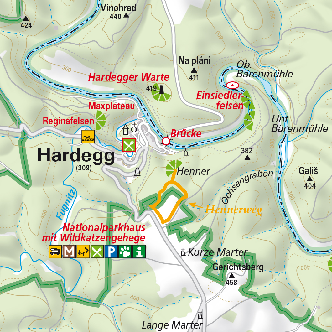 To get to the Hennerweg, you have to cross the main road from the National Park House above the camper van site and enter the forest. Initially, the trail follows the Einsiedlerweg, but after a short stretch it continues to the right (orange markings).Theme trails with six stations provide variety in addition to the constantly changing nature all year round. It ranges from early flowers such as daphne and cowslip to the discoloured autumn leaves of beech trees and rustic oaks. It allows you to learn more about the important role of deadwood or the predominant tree species of the Thayatal, peep through peepholes or feel in touch boxes.